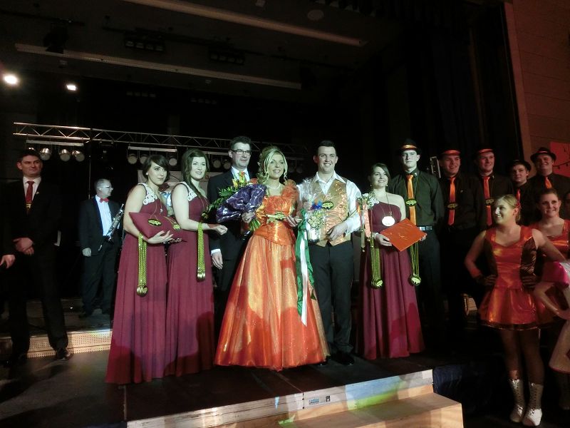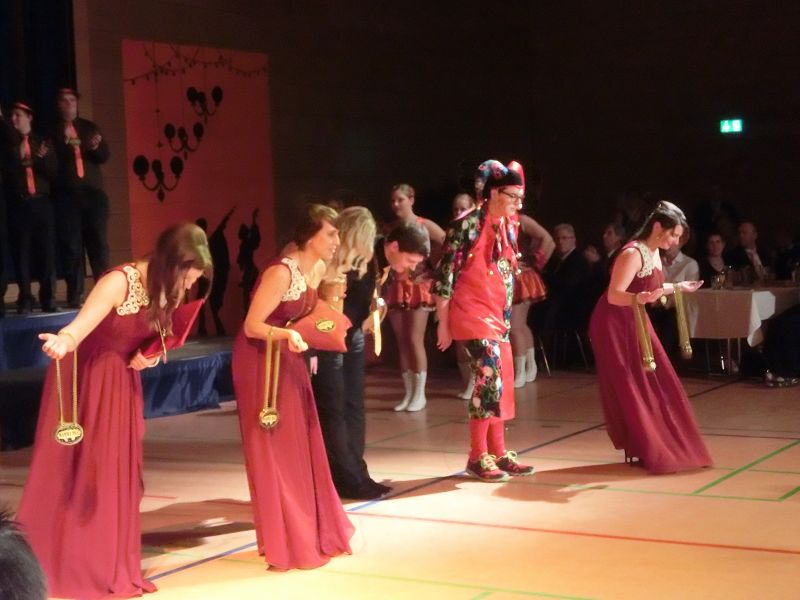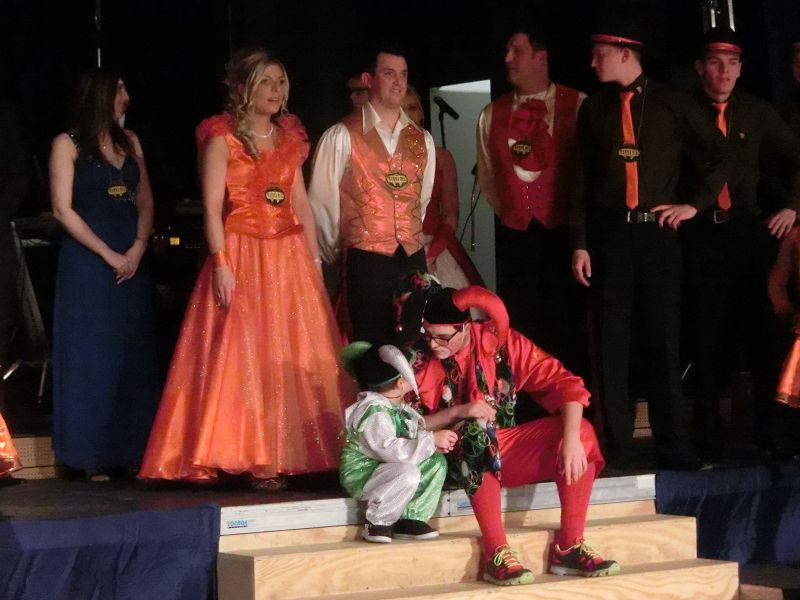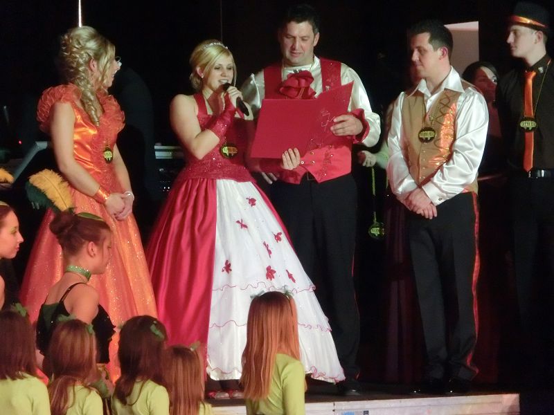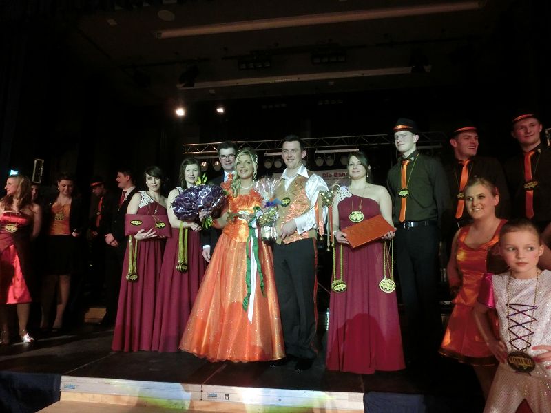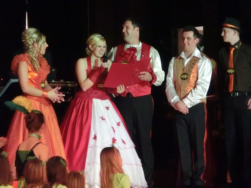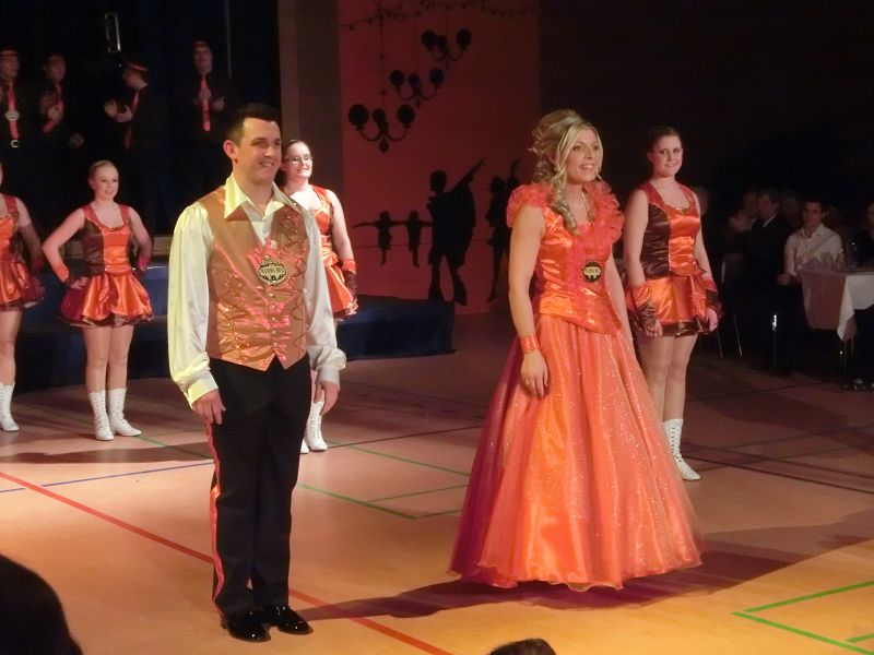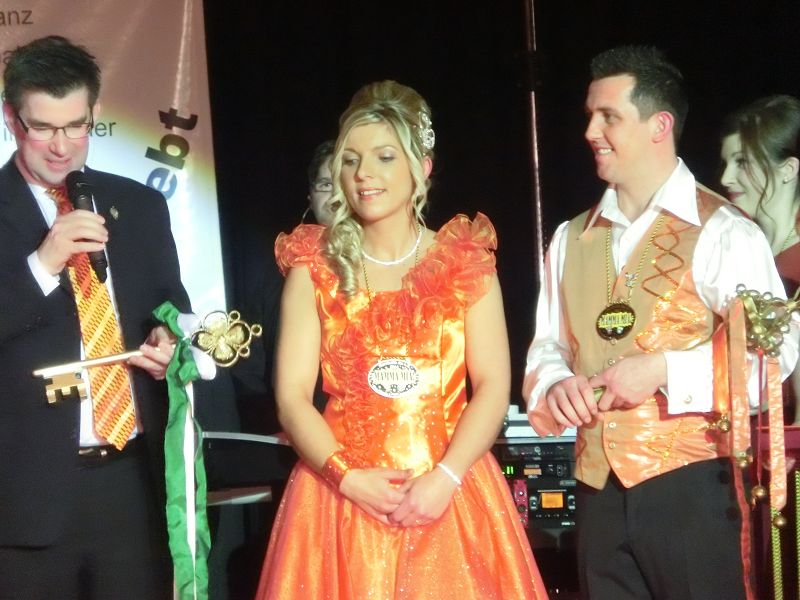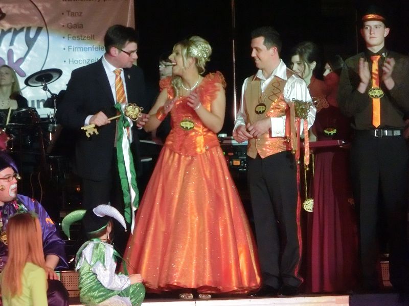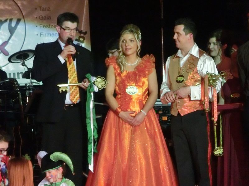 Gegen 22 Uhr dann der Höhepunkt - der Einmarsch der Garde, der Elfer, der Jugendgruppen und des Prinzenpaares. Ihre Lieblichkeit, Eva-Maria Straßberger, in einem Traum in Orange, begleitet von Sebastian Hillebrand, dem Neffen des letztjährigen Faschingsprinzen, farblich passend - ein wirklich attraktives Paar. Vom letztjährigen Prinzenpaar Jenny und Michael erhielten sie dann feierlich den Regentenstab, danach vom Bürgermeister den frisch gestrichenen Rathausschlüssel. "Deads unsern Markt guat vertreten" und "bittschön die Marktkasse net plündern" gab er ihnen in seiner Rede mit auf den Weg. Er zeigte sich erfreut, dass so viel Jugend nachwachse, das mache ihm Hoffnung, dass er im Alter im Kursana Seniorenheim noch Besuch von der Narhalla bekäme.