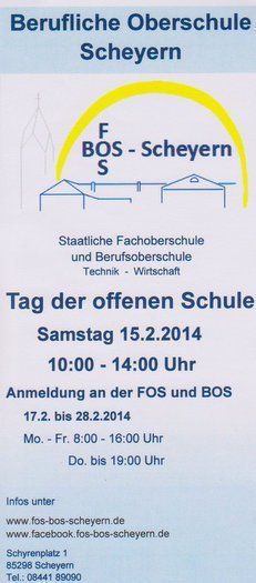 Wer die hochinteressante und umfangreiche Informationsveranstaltung in der Mittelschule Pfaffenhofen versäumt hat, oder noch mehr zum Thema Übertritt in die FOS oder BOS wissen will, der hat am 15.Februar 2014 vor Ort in Scheyern die Gelegenheit, seinen Wissensdurst zu stillen.