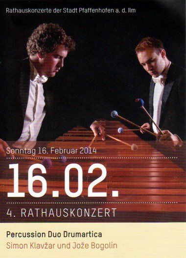Duo "Drumartica" ist zur Zeit eines der bekanntesten Percussion-Ensembles in Europa. Nach großen Erfolgen bei renommierten Wettbewerben in Luxemburg (IPCL) und Bulgarien (PENDIM) gab das Duo Konzerte in den USA, Russland und ganz Europa. Solchermaßen junge Berühmtheiten nun im voll besetzten Pfaffenhofener Rathaussaal, es wurde ein grandioser Abend. Schon fast klassische Stücke von Alejandro Viñao, Thierry deMey und Béla Bartók erklangen, aber auch Ungewöhnliches, selbst in Auftrag Gegebenes von Bruce Hamilton aus neuerer Zeit. „Night Trips“, passend zum Ereignis, hieß das mit elektronischen Klängen parallel hörbargemachte Werk des Kanadischen Komponisten, teilweise sehr mächtig, hob es sich deutlich vom Gewohnten ab, ein Suchen und Finden im Internet lohnt sich.