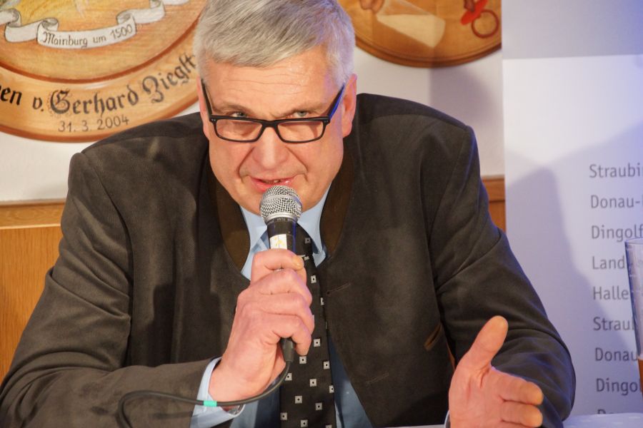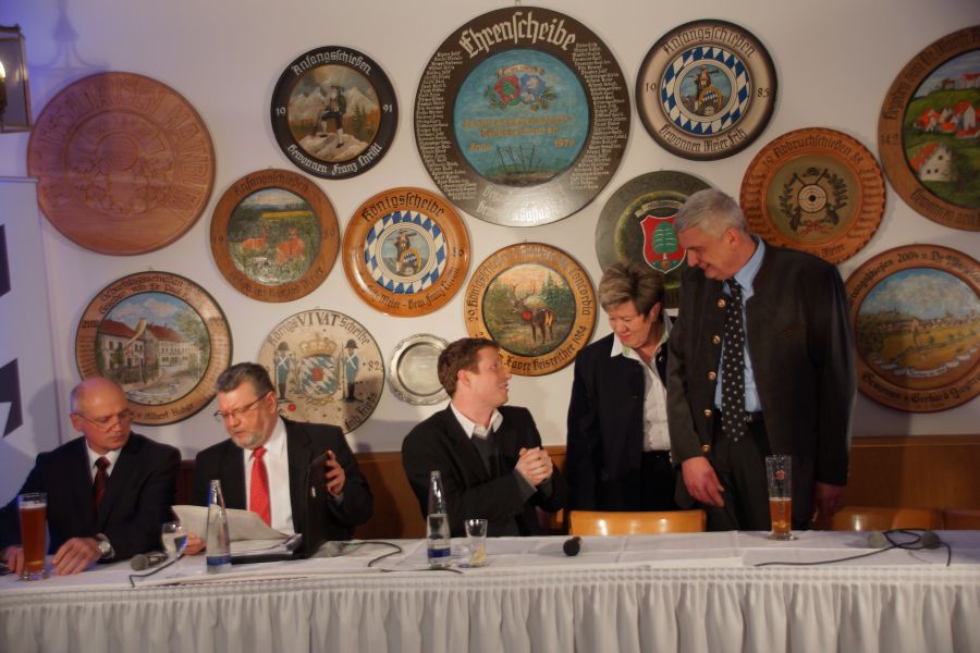 Nach den etwa einstündigen Wahlreden, konnten den vier Bürgermeisterkandidaten Fragen gestellt werden. Als erster meldete sich der ehemalige 2. Bürgermeister Franz Gmeiner zu Wort, der sehr darüber erzürnt war, dass das Mainburgwappen vom Briefkopf der Stadt in die unterste Ecke „verdammt“ und durch einen stilisierten Hopfengarten ersetzt wurde.