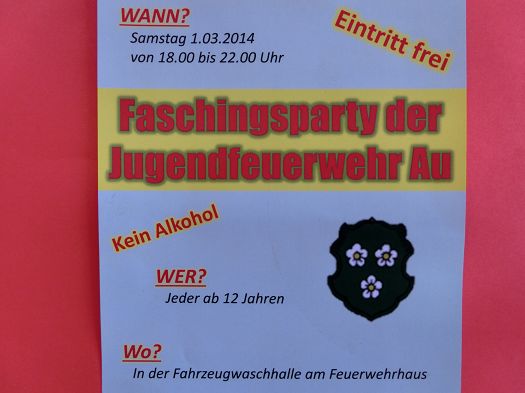 Die Jugendfeuerwehr Au veranstaltet am Faschingssamstag, dem 1.3.14, eine große Faschingsparty in der Fahrzeugwaschanlage am Feuerwehrhaus. Auch Nichtmitglieder ab 12 Jahren sind herzlich eingeladen, der Eintritt ist kostenlos, es gibt keine alkoholischen Getränke. Beginn ist um 18 Uhr, Ende ca 22 Uhr.
