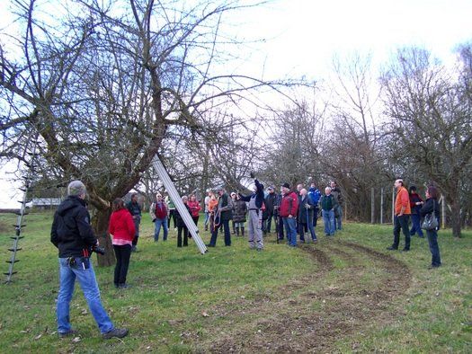 Zunächst stellte Mächler klar, dass es bezüglich des Schnittzeitpunktes keine pauschale Lösung gibt. Dieser sollte ja nach Baumart und Ziel der Maßnahme festgelegt werden. So hat der sogenannte Sommerschnitt von Ende Juli bis Anfang August entscheidende Vorteile gegenüber der Pflege im zeitigen Frühjahr. Er nimmt dem Baum die im Laufe des Jahres aufgebaute Energieeinlagerung und bewirkt ein geringeres Wachstum im folgenden Jahr, sowie die vermehrte Bildung von Fruchtholz. Außerdem kann auf die Wuchsform des Baumes in beblättertem Zustand reagiert werden.