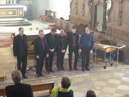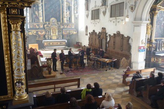 Kulturpreisträger Michael Leopold an seinem Vibraphon war, neben Prof. Peter Wittrich am Akkordeon, der auffälligste Musiker. Natürlich geht es nicht ohne Bass und Bläser, doch das Auge hört mit. Die Umsetzung der einzelnen Passagen fand auch in Bewegung durch den Kirchenraum, Penger (Saxophon), Greiner (Trompete) und Gregg (Posaune) statt. Mozart hätte sicher seine helle Freude an der Bearbeitung seiner Maurerische Trauermusik gehabt, Wittrich ist praktisch die Metamorphose für diese grandiose Bearbeitung.