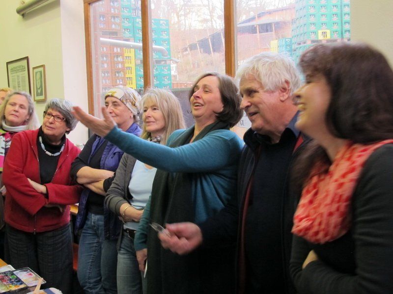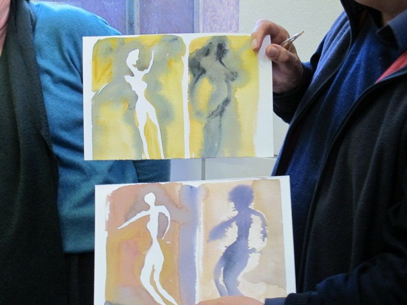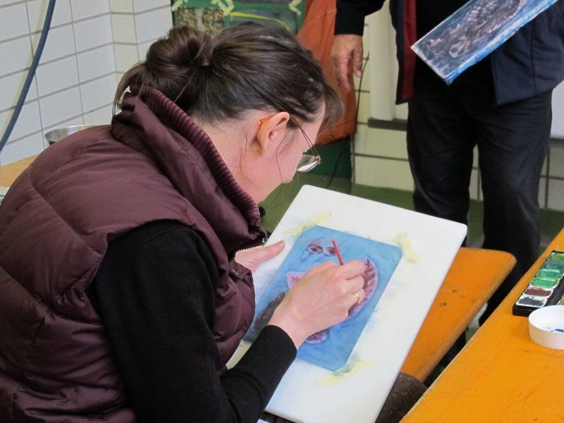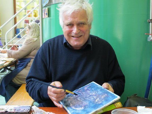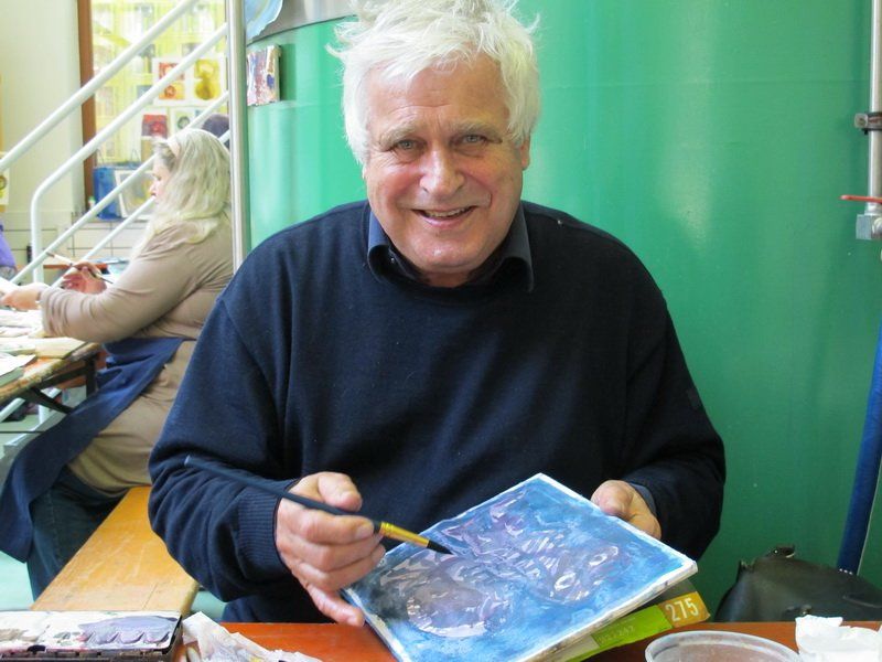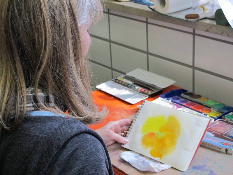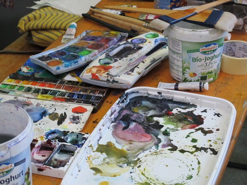 In der Schlussbesprechung geht Prof. Klein auf jedes der Gemälde ein. Alle lernen noch einmal mit, würden gerne weiter malen mit all der Anerkennung und dem Verständnis durch den besten Aquarell-Didakten Deutschlands. Das ist auch der Grund, warum viele wieder kommen oder ehemalige Student(inn)en, die inzwischen erfahrene Kunstpädagoge(inn)en geworden sind.