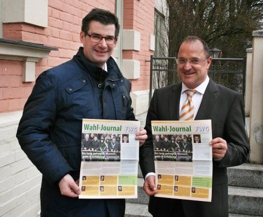 Bürgermeister und Spitzenkandidat Karl Ecker und "Wahlkampf-Berater" Alexander Herzog, der diese Zeitung entwickelt hat, freuen sich über die großartige Resonanz des „Wahl-Journals“ der FWG in der Bevölkerung.