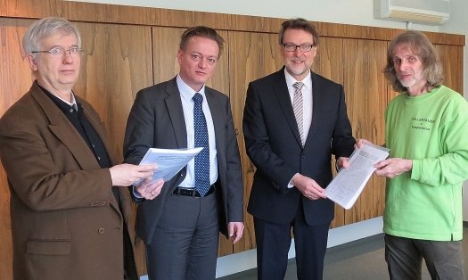 Bernd Duschner, Vorsitzender des Vereins Freundschaft mit Valjevo (l.) und Manfred „Mensch“ Mayer (r.) übergaben an Landrat Martin Wolf (2.v.r.) und Landtagsabgeordneten Karl Straub eine schriftliche Petition mit der sie die Abschiebung von Asylbewerbern aus dem Landkreis verhindern wollen. (Foto: Landratsamt Pfaffenhofen)
