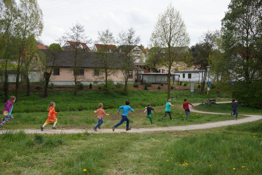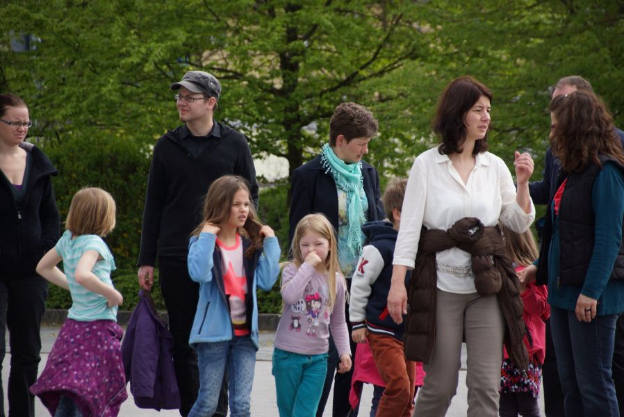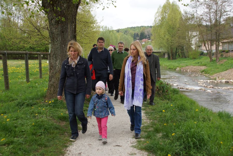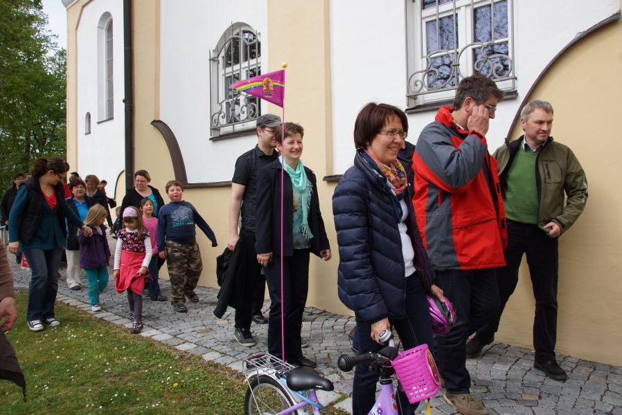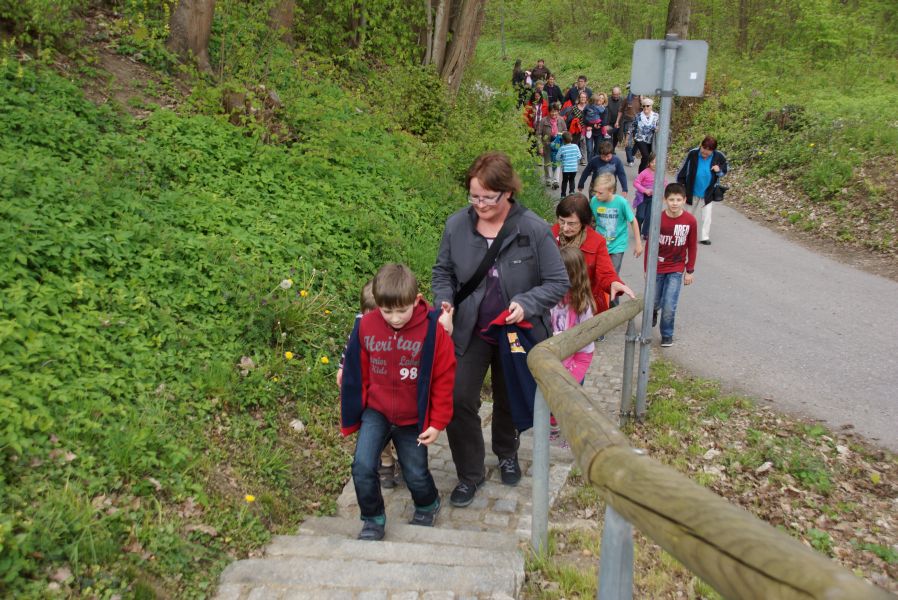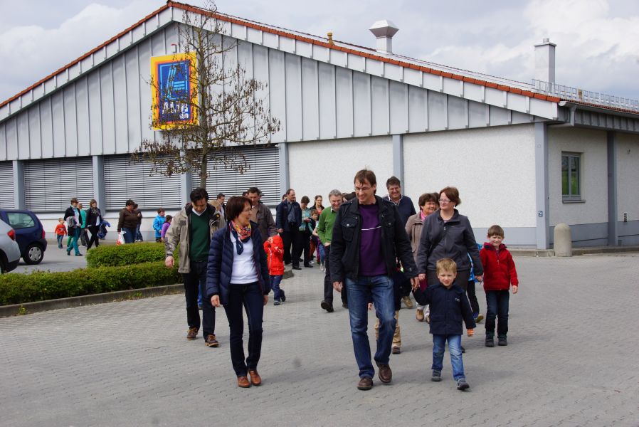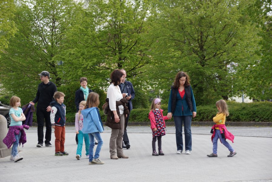 Nach diesem Vorbild organisierte der Sachausschuss Ehe und Familie der katholischen Pfarrei eine Familienwanderung zur Salvatorkirche. An die 60 Kinder, Eltern und einige Großeltern trafen sich dazu auf dem Aldi Parkplatz und marschierten bei sommerlichen Temperaturen, an der Abens entlang, Richtung Kloster.