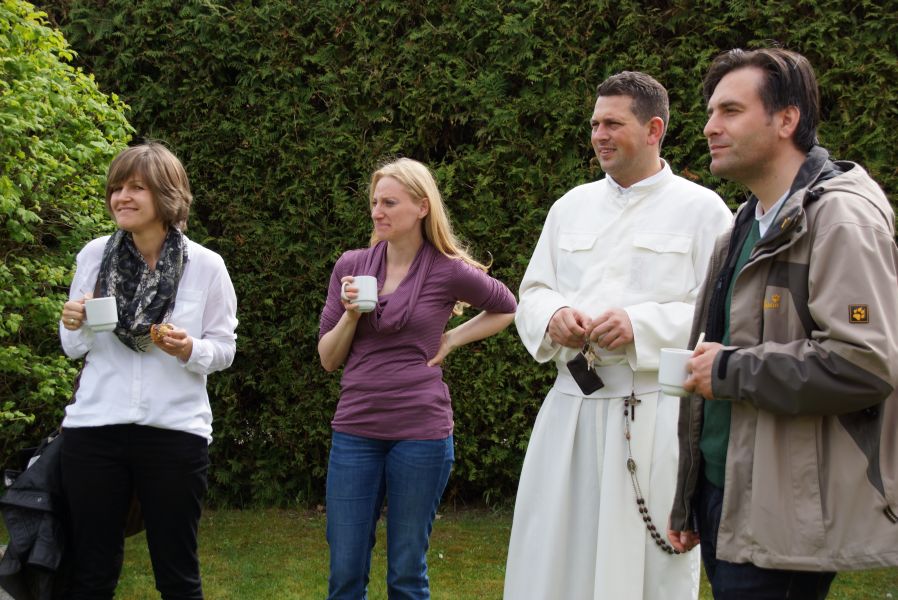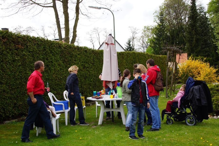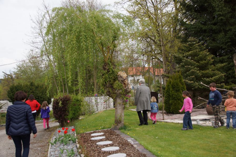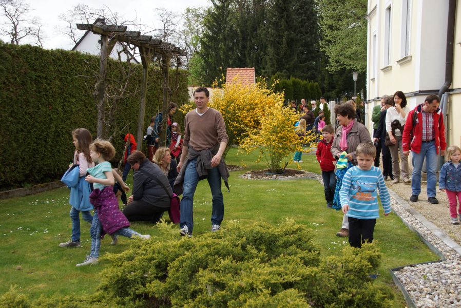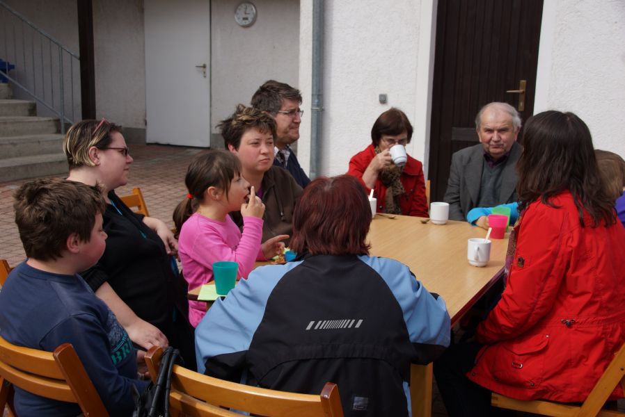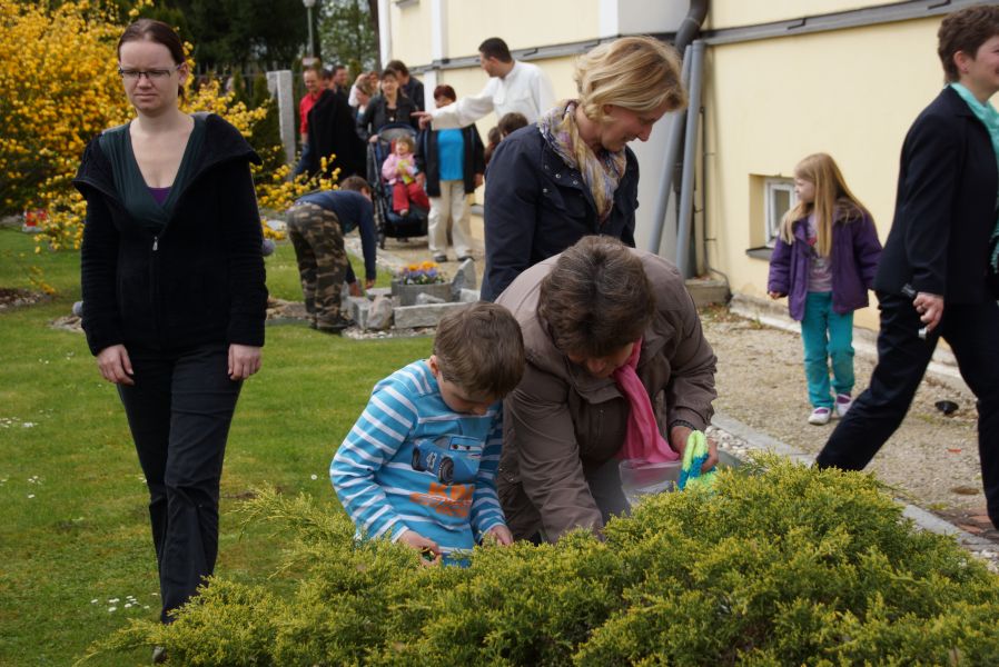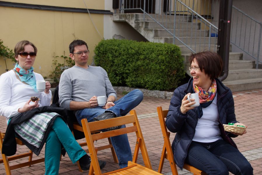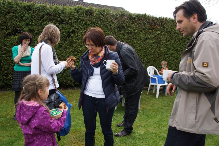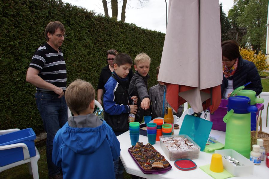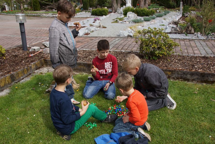 Im Klostergarten versteckte er unzählige Schokoladeneier, die innerhalb kürzester Zeit aufgesammelt wurden. Einige davon verschwanden sofort in den Mündern, genauso wie der saftige Kirschkuchen und die leckeren Muffins. Dazu gab es Kaffee, Limo und sogar kühles Bier.