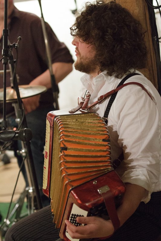 Auf dem Programm: Titel wie „Cold Cold Heart“ von Hank Williams oder ganz im Stile von Gene Autry mit „Let the Rest of the World Go By“ – gespielt im Dreivierteltakt mit Violine und statt der kräftigen Stimme pfeift Judith Jung in das Mikrofon. Stilistisch kombinieren die vier Musiker unterschiedliche Genres, darunter Django-Reinhardt-Jazz, Tex-Mex oder Ska-Blues mit Einflüssen vom New Orleans Jazz oder sogar dem Berliner Liedgut aus den Zwanziger Jahren. Besonders interessant ist die Vielfältigkeit der Stücke und vor allem der Musiker, die mehrere Instrumente spielen. So zeigt Michael Reiserer, dass er neben dem Akkordeon gleichzeitig noch sein Schlagzeug bedienen kann.