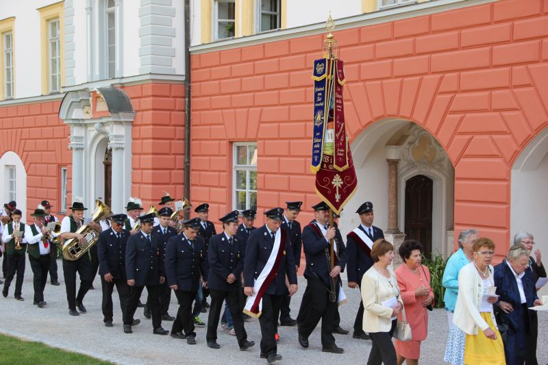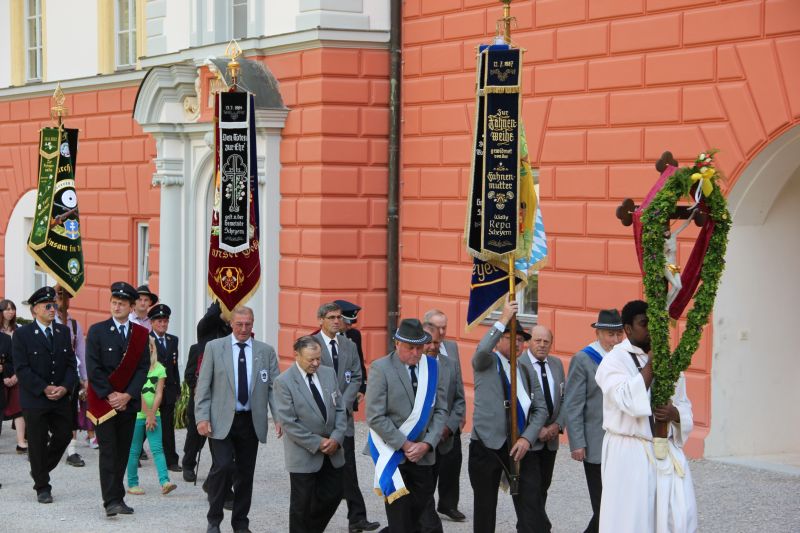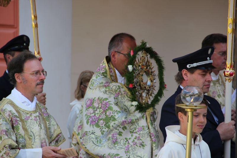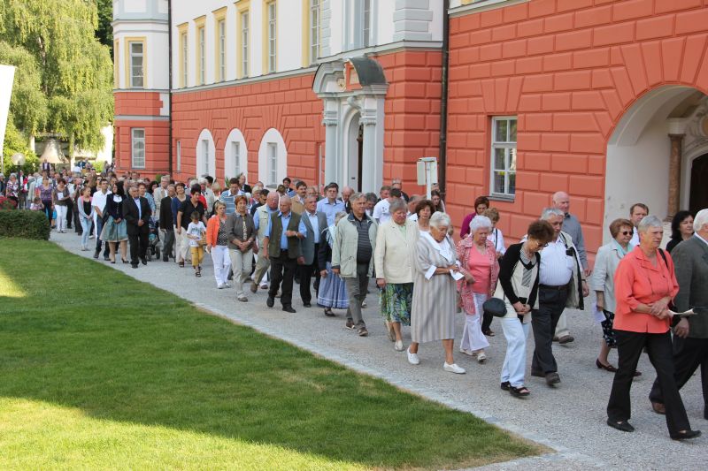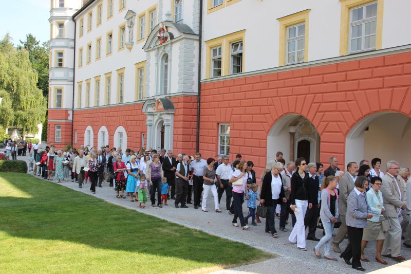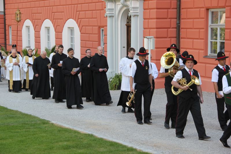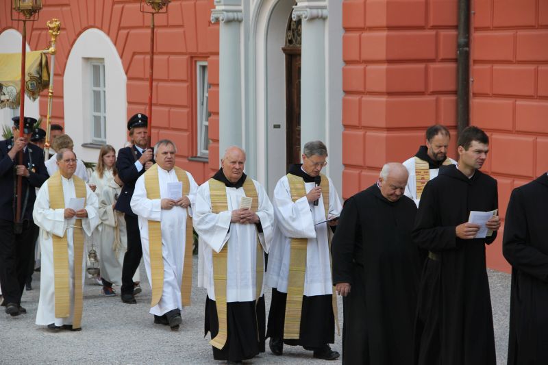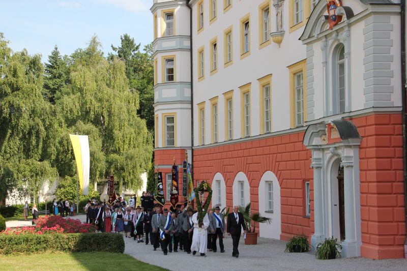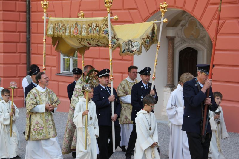 Traditionell begann die Fronleichnamsprozession auch in diesem Jahr im Innenhof des Scheyrer Klosters. Nach Ende der morgendlichen Eucharistiefeier in der Basilika nahm neben den Scheyrer Gläubigen auch wieder eine Abordnung slowenischer Gäste in folkloristischer Festkleidung Aufstellung, um der Prozession zu folgen. Herrlichstes Sommerwetter begleitete die ganzen Feierlichkeiten.