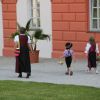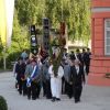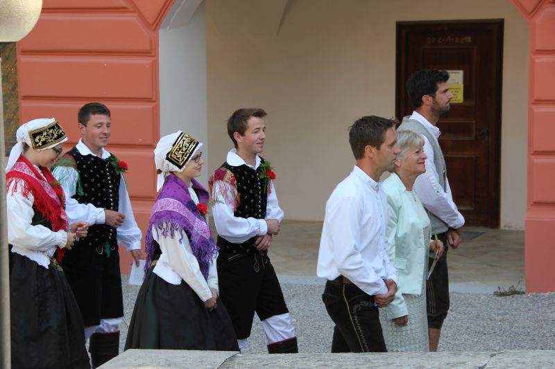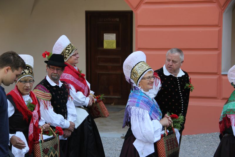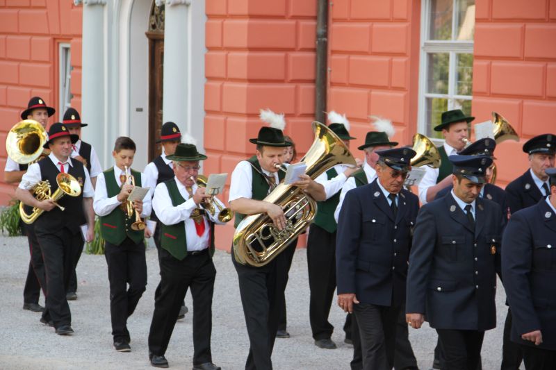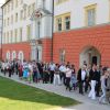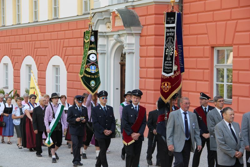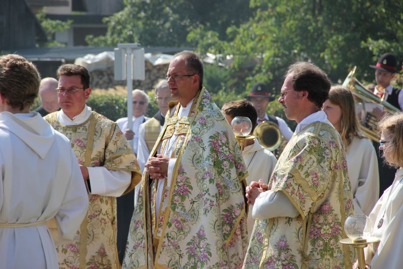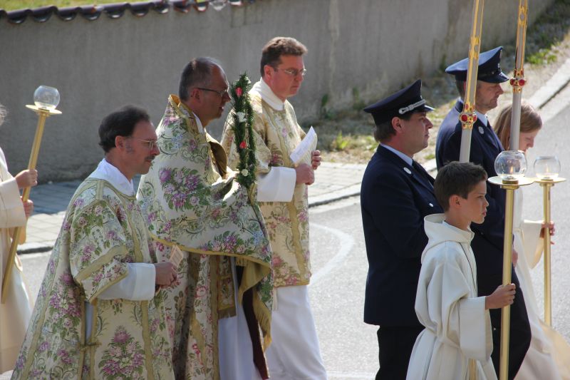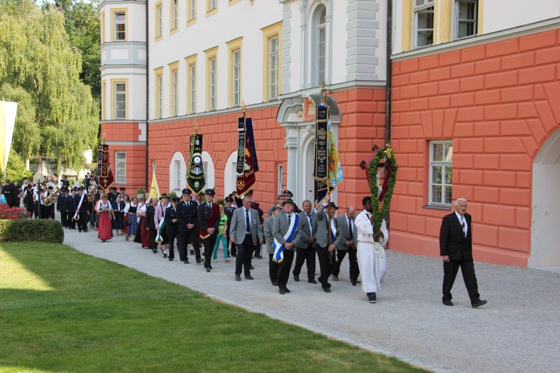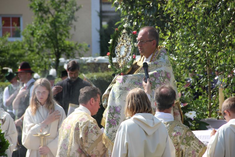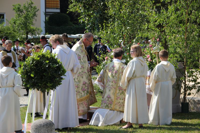 Traditionell begann die Fronleichnamsprozession auch in diesem Jahr im Innenhof des Scheyrer Klosters. Nach Ende der morgendlichen Eucharistiefeier in der Basilika nahm neben den Scheyrer Gläubigen auch wieder eine Abordnung slowenischer Gäste in folkloristischer Festkleidung Aufstellung, um der Prozession zu folgen. Herrlichstes Sommerwetter begleitete die ganzen Feierlichkeiten.