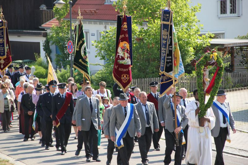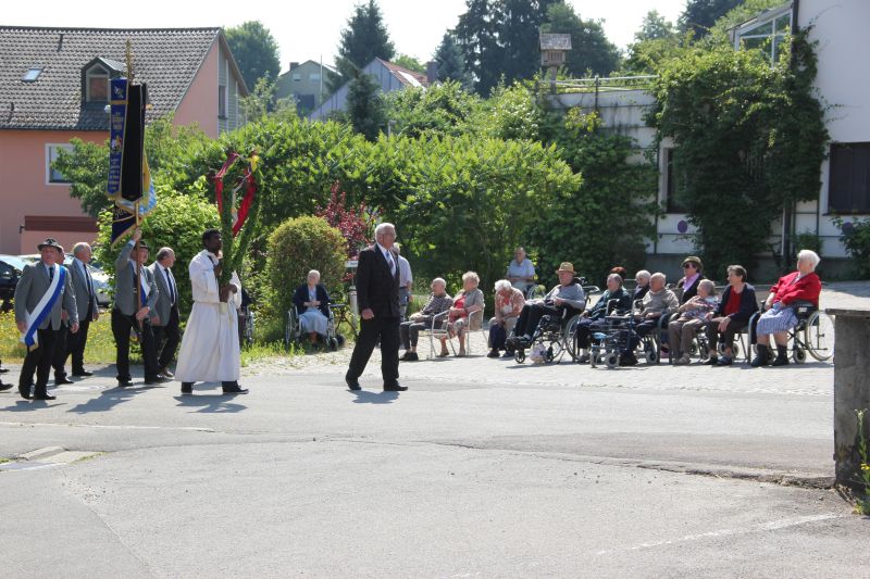 In der zuvor festgelegten Reihenfolge führten Kreuz und Begleiter den Prozessionszug an, es folgten Fahnenabordnungen und Vereine, Freiwillige Feuerwehr, Musikkapelle, Kinder und Jugend, Altardienst und Konvent, DAS ALLERHEILIGSTE, Gemeinderat, Pfarrgemeinderat und Kirchenverwaltung, Chor, Familien und Gemeindevolk. So zog die Prozession vom Innenhof des Klosters zum Kreuz am Scheyrer Ortseingang, vorbei am Kindergarten St. Martin hinunter zur Mariensäule, wo noch einmal für ein Gebet inne gehalten wurde. Danach ging es zum Altenheim, wo den Bewohnern der Segen gespendet wurde, und über den Hof der Familie Euringer (Jagerbauer) schließlich zurück in den Innenhof des Klosters.