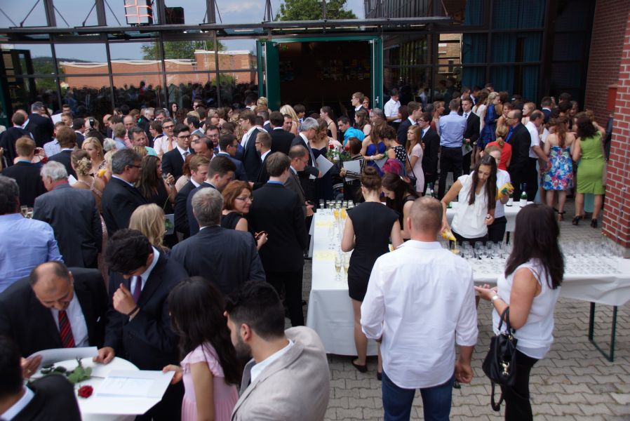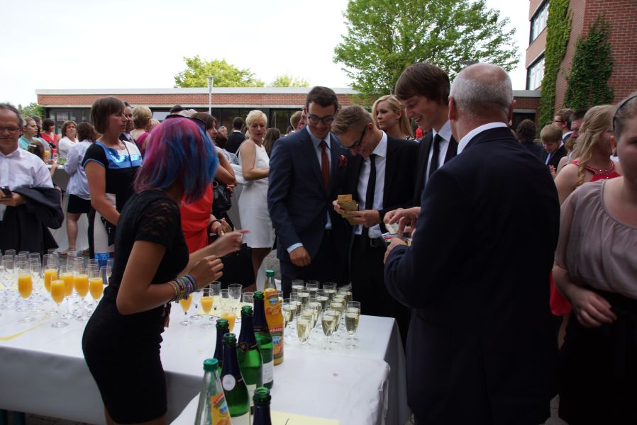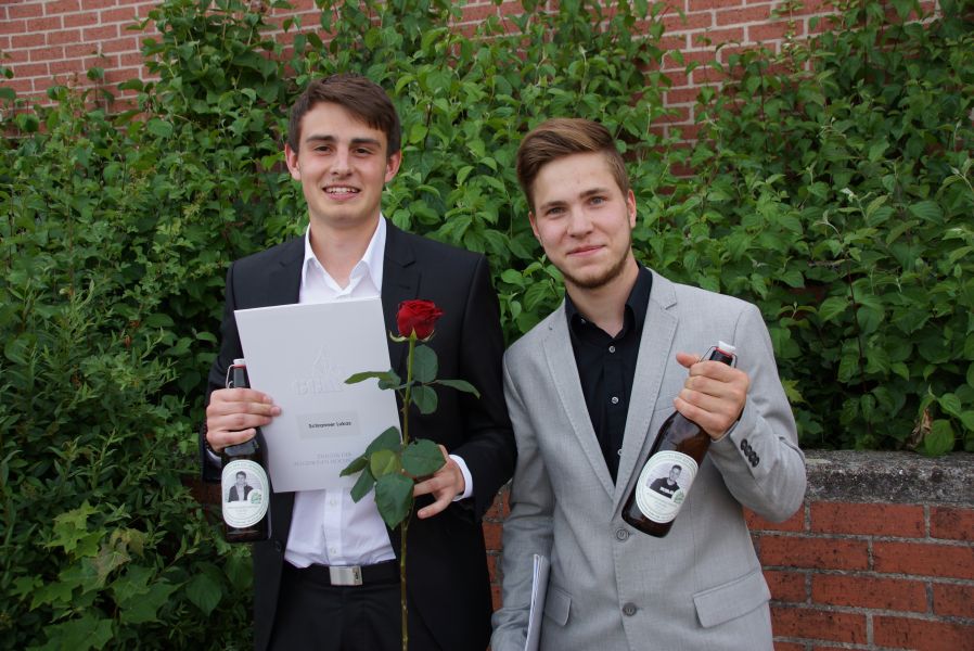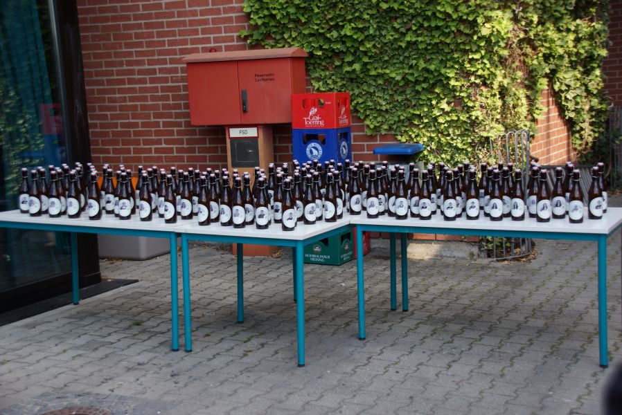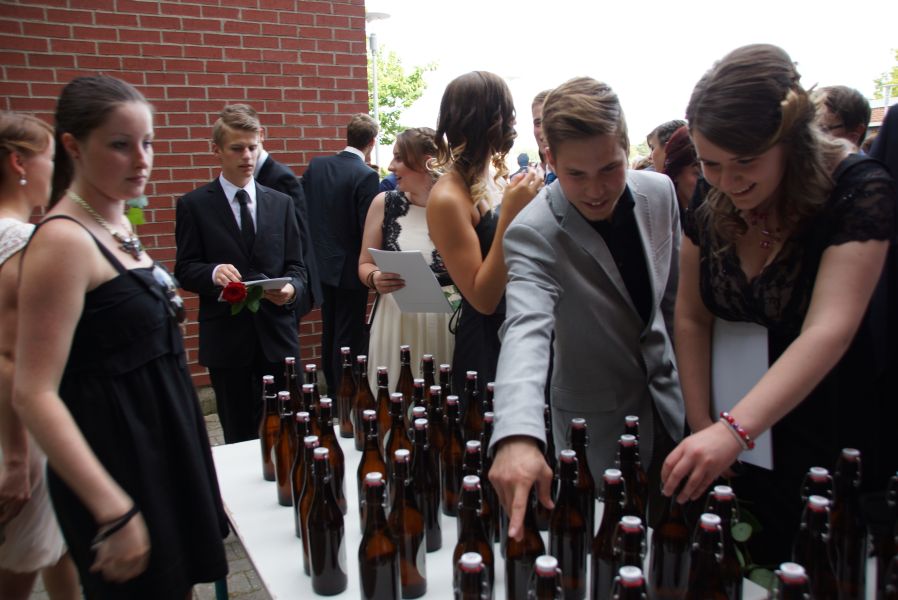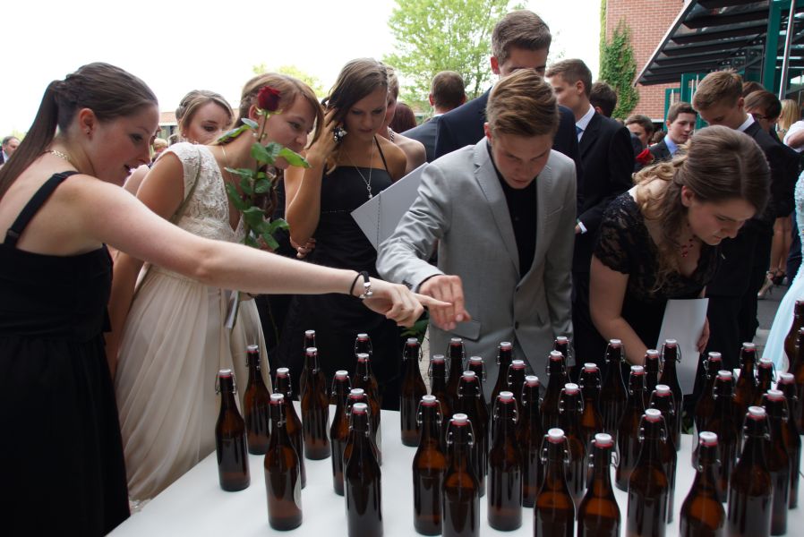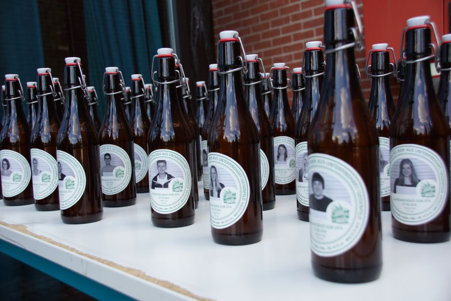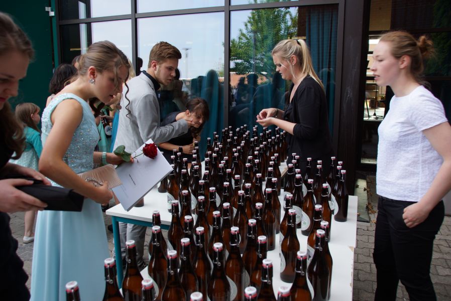 Auf dem Schulhof warteten schon Sekt bzw. alternativ Orangensaft für die ganze Gesellschaft. Die Schulabgänger jedoch, hatten sich selber noch ein ganz besonderes Geschenk gemacht. Für jeden Stand eine Flasche selbst gebrautes Bier des Landgasthofes Rockermeier bereit, dass sie höchstpersönlich in Flaschen mit ihrem Foto, abgefüllt hatten.