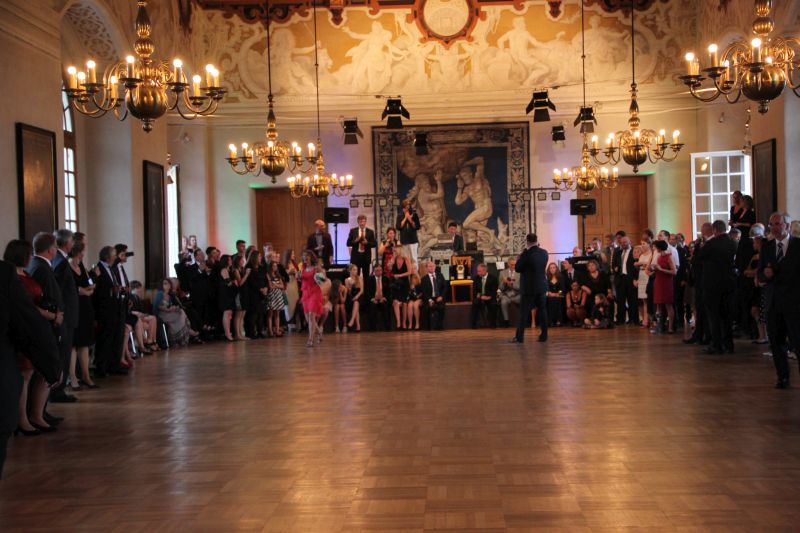 "In den einmaligen Räumlichkeiten des Schlosses Dachau werden seit Jahrhunderten rauschende Feste ausgerichtet, die in die Geschichte eingegangen sind." So heißt es in der Werbebroschüre der Schlossgastronomie. Zumindest für den Abi-Jahrgang 2014 des Schyren-Gymnasiums wird auch dieses Fest in die Geschichte eingehen. Mit einem Einzug der Abiturientinnen und Abiturienten begann die Abschlussparty, veranstaltet von der vhs-Dachau und Stephan Pokorny, die dann nach einer eher klassischen "Eintanzphase" letztendlich in einen rhythmischen und Foxtrott-getriebenen, in jedem Fall aber rauschenden Tanzabend überging, bei dem kaum jemand auf den wenigen bereitgestellten Stühlen sitzen blieb. Wem es im Festsaal dann aber doch zu heiß wurde, der begab sich auf die angrenzende Terrasse mit dem wunderschönen Blick in einen der reizvollsten Schlossparks Bayerns und weit über die Dächer Münchens bis in das Alpenvorland hinaus.