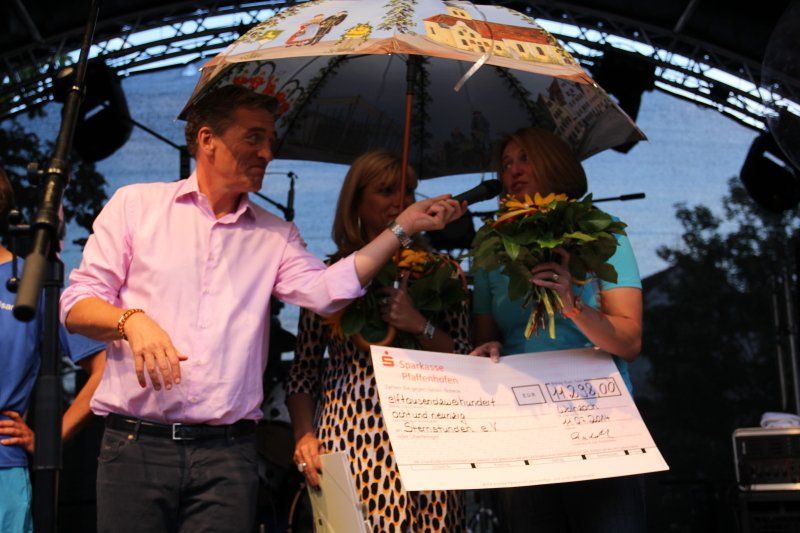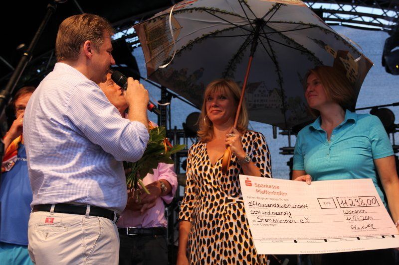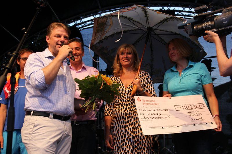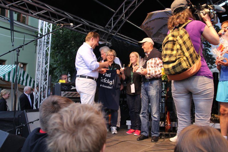 Aber bevor man gemeinsam mit der Miro Nemec Band so richtig abrocken durfte, stand noch eines auf dem Programm: die Scheckübergabe an Sternstunden, und auch da gab es einen neuen Rekord zu vermelden. Einen Scheck über 11.298 Euro konnte der Rathauschef der stellvertretenden Redaktionsleiterin der Abendschau Astrid Freyeisen überreichen. Und das Strahlen in den Gesichtern war auch hier riesengroß. „Das habt ihr alle zusammen erlaufen“, so Bürgermeister Jens Machold, der natürlich auch selbst wieder mit am Start war und die „Wolnzacher Wand“ zum wiederholten Mal bezwungen hat. Mit diesem Glücksgefühl im Rücken ließ es sich auf dem Marienplatz dann gleich doppelt feiern, denn nicht nur der Markt, sondern auch der Rathauschef feierten an diesem Tag Geburtstag.