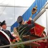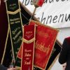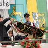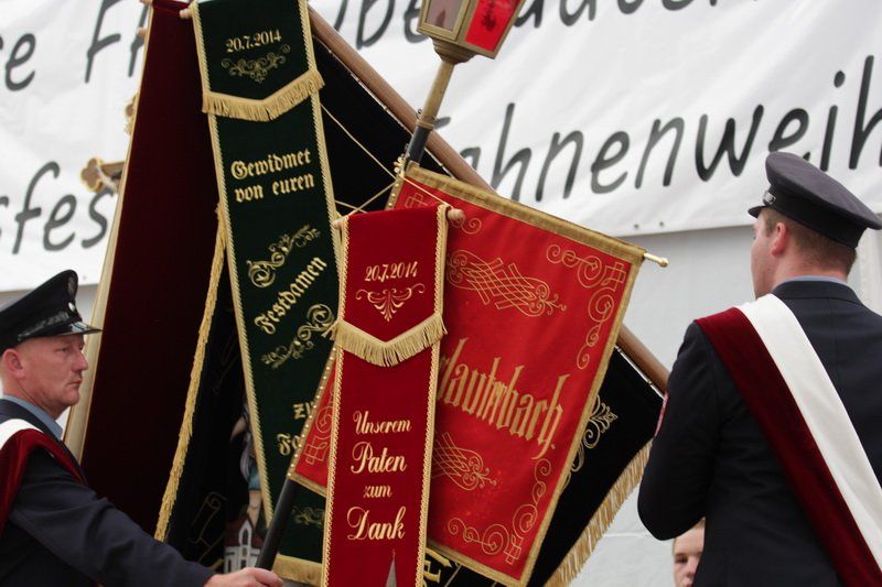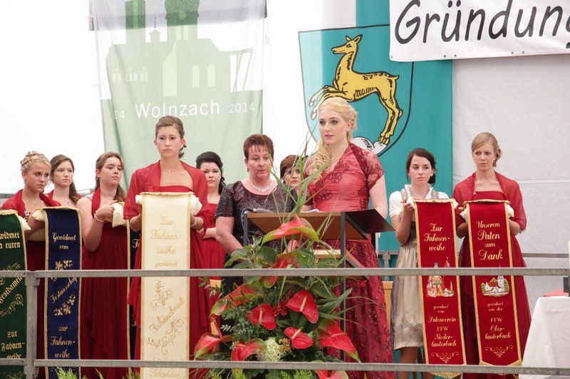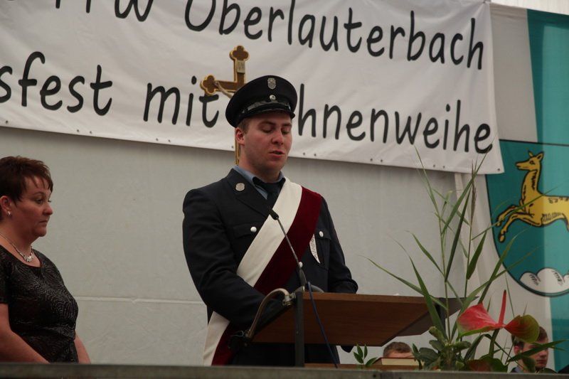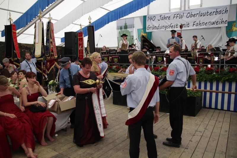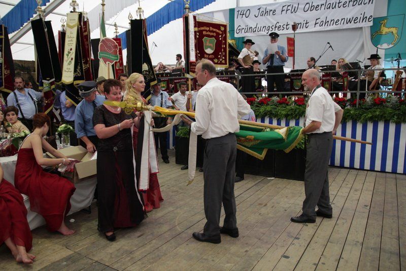 Nach diesen Worten, war es nun Zeit, die neue Fahne, die auf der einen Seite die Kirche von Oberlauterbach und auf der anderen den Schutzpatron aller Feuerwehrmänner zeigt, erstmals zu enthüllen und nach dem Segen der Öffentlichkeit zu zeigen. Diese Ehre gebührte Fahnenjunker Michael Sandbichel. In einem Festzug zogen die Vereine und Kapellen einmal quer durch Oberlauterbach. „Es war gar nicht so leicht“, erklärte Alfons Lemle, Vorstand der Feuerwehr. Rund 1400 Feierende zogen gemeinsam mit den Oberlauterbachern durch die Straßen. „Einfach gigantisch“, so das Resümee von Kommandant Christian Portner. Dem hatte auch der Vorstand nicht mehr hinzuzufügen: „Es war ein wunderschönes Fest. Aber besonders freut mich der große Zusammenhalt und die großes Hilfsbereitschaft.“ Schon bei den Vorbereitungen hatte jeder mitgeholfen, so wurden die drei Tage wirklich zu einem unvergesslichen Erlebnis. „Uns hat es sehr gefreut, dass so viele gekommen sind, um gemeinsam mit uns zu feiern“, fügte Lemle weiter an. Und damit man sich auch noch lange an diesen Tag erinnern wird, übereichte Fahnenmutter Monika Lemle gemeinsam mit Fahnenbraut Sabrina und den Festdamen Bänder für über 80 Fahnen.
