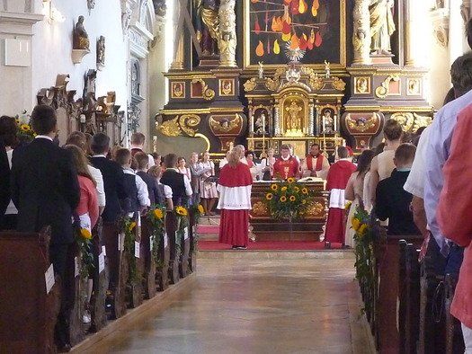 Domkapitular Dr. Michael Kreuzer aus Augsburg spendete in diesem Jahr das Firmsakrament. Seine Worte waren eindringlich, behutsam und hoffnungsvoll. Die Macht des Heiligen Geistes im Auge der Firmlinge, die lodernde Flamme des Glaubens und die Sicherheit, die die Gemeinschaft der Gläubigen bietet, der Initiationsritus des katholischen Glaubens macht die jungen Menschen zu vollwertigen Mitgliedern der Gemeinde.