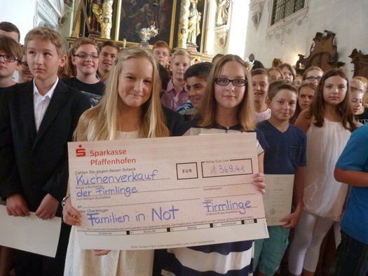 Gemeindereferentin Jutta Rödler oblag die Aufgabe, als Vertretung für Stadtpfarrer Frank Faulhaber die Worte und Wünsche der Pfaffenhofener Gemeinde zu überbringen. Die Vorbereitung zur Firmung hatte schon Anfang des Jahres begonnen und war sehr intensiv und lehrreich. Die jungen Menschen sollen geistig vorbereitet vor ihren Bischof treten, die Geschenke der Paten und Verwandtschaft mal hinten anstehen. Die Spende von 1369,41 €uro für Familien in Not haben die Jugendlichen mit eigenem Kuchenverkauf erwirtschaftet, da war noch kein „Firmgeld“ in Aussicht.