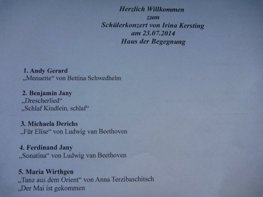 Siebzehn junge und ganz junge Schülerinnen und Schüler zeigten ihr Können an den schwarz-weißen Tasten. Teilweise Note für Note, was bei Elise von Beethoven ein ganz neues Hörgefühl erweckte, teilweise ohne Blatt und sehr emotional. Für mich als musikalischen Laien ist es immer wieder erstaunlich, wie man die schwarzen Punkte auf dem Papier in Bewegung und Klänge verwandeln kann. Schön für die, denen diese Gabe geschenkt ist und noch besser, wenn sie eine Lehrerin haben, die dieses Talent formen kann.