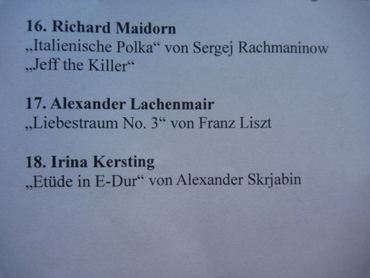 Zum Abschluss gab Irina Kersting noch einen kleinen Einblick, was dabei herauskommt, wenn Talent und Fleiß zusammenwirken. „Etüde in E-Dur“ von Alexander Skrjabin stand auf dem Programm, natürlich ein Russe, mit einem beeindruckenden Bart, wie er so in Wikipedia abgebildet ist. Die Musik ist schwer beeindruckend und die Art, wie sie Irina Kersting vorträgt, noch mehr. Da haben die Schüler noch viel Arbeit vor sich, aber erst einmal sind jetzt Ferien angesagt.