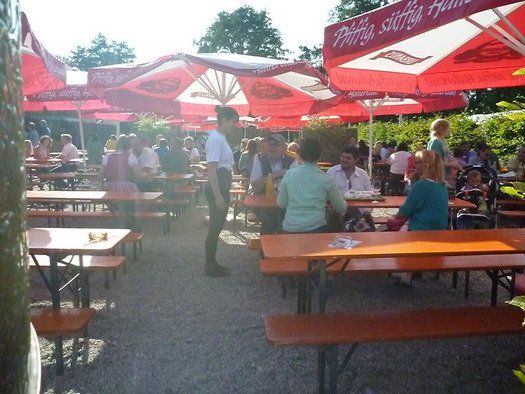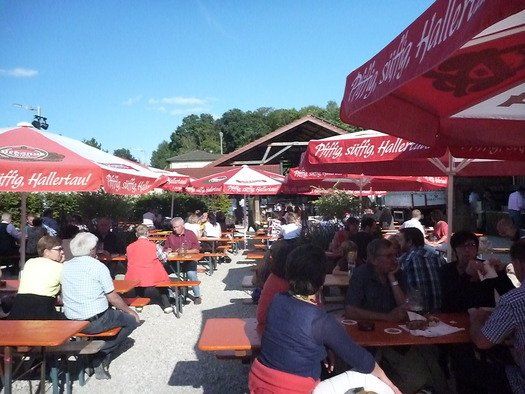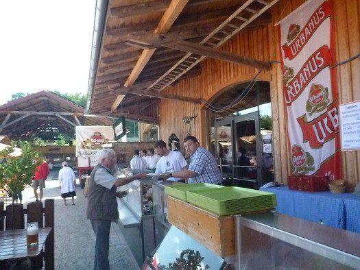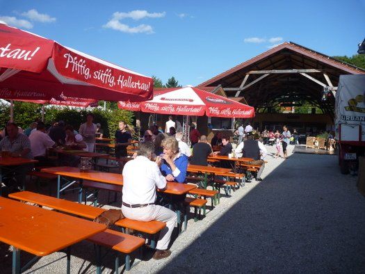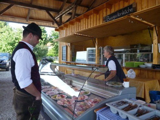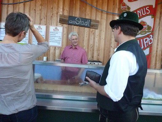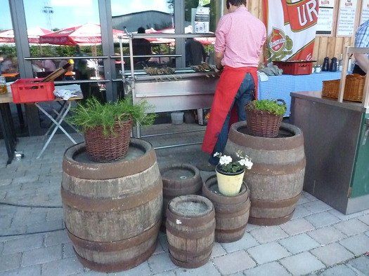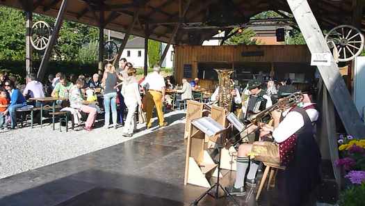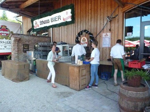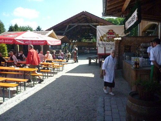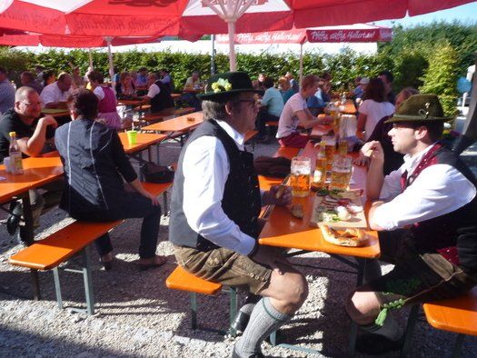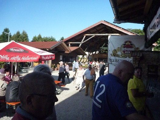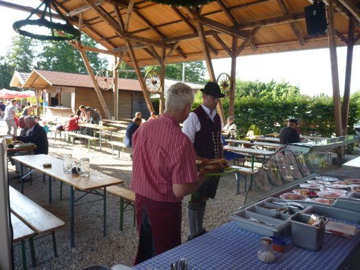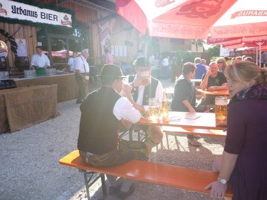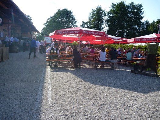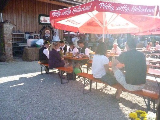 Beim Stocker tröpfelten die ersten paar Tage nur die hartgesottenen Gäste, neben den täglichen Regenschauern ein. Am Sonntag schien der zuständige Wettermacher aus dem Urlaub zurück und bescherte nicht nur einen sonnigen Weißwurscht - Frühschoppen mit Festbier und Brezen, sondern erlaubte dem Trio "Hearst na scho" einen Auftritt unter freiem Himmel.