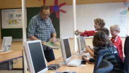 Der Fachmann ging mit den Kindern auch den Aufbau einer Kamera durch und erläuterte sämtliche Einstellungen und Funktionen der modernen Digitalkamera. Ganz nebenbei verriet er nützliche Tipps, so z.B. dass man die normale Akkudauer nahezu verdoppeln kann, wenn man den Bildschirm ausschaltet und stattdessen über den Sucher fotografiert.