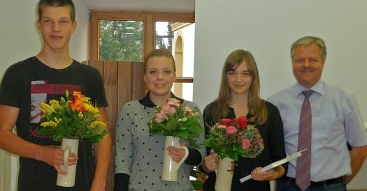 Einen Blumenstrauß sowie ein Heimatbuch für besondere Leistungen erhielten als erstes die Schulabgänger Lisa Fritsch (1,12) von der Berufsschule Landshut, Marco Schütt ( 1,8) von der Mittelschule Neustadt und Nina Sedlmeier (1,94) von der Mittelschule Siegenburg. Während Nina Sedlmeier nun eine Ausbildung bei der Firma Wolf in Mainburg zur Fachkraft für Lagerlogistik anstrebt, hat Marco Schütt vor, die 10. Klasse zu machen und somit die Mittlere Reife zu erlangen. Lisa Fritsch hat bereits eine abgeschlossene Ausbildung zur Pharmazeutisch-Kaufmännischen Angestellten bei der Apotheke Köglmeier in Siegenburg hinter sich. Sie hat in der Berufsschule Landshut als Einzige in diesem Jahr den Bayerischen Staatspreis für herausragende Leistungen von Hubert Aiwanger überreicht bekommen.