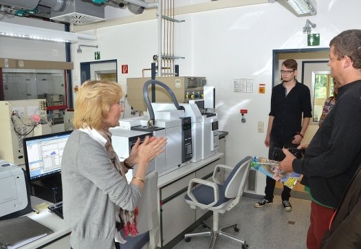 Die Leiterin der "Arbeitsgemeinschaft Züchtung", Elisabeth Seigner, führte durch die Labore des Institutsgebäudes und die Gewächshäuser. "Die Beratung der Pflanzer ist uns bis heute wichtig", betonte die Forscherin beim Rundgang und erläuterte die Entstehungsgeschichte der Forschungseinrichtung. Ins Jahr 1926 reiche sie zurück und habe zum Anlass das Auftreten des Falschen Mehltaues in der Region gehabt. Nicht ohne einen gewissen Stolz präsentierte Seigner die in diesem Jahr für etwa 100.000 Euro neu angeschafften Apparaturen - unter anderem ein Gaschromatograph und ein Massenspektrometer - zur Aroma-Analytik.