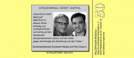 Regionalgeld: “ist eine lokale Komplementärwährung, die innerhalb des regionalen Währungsgebiets als Zahlungs-, Investitions- und Schenkungsmittel zwischen Verbrauchern, Anbietern und Vereinen verwendet wird“, so WIKI. In Pfaffenhofen ist es der Hallertauer, der seit mittlerweile 10 Jahren in unterschiedlichen Erscheinungsformen als Zahlungsmittel bei den entsprechenden Akzeptanzstellen eingesetzt werden kann. Das Besondere an unserer heimischen Währung sind die 3 % des generierten Wertes, die in ein Kunstprojekt fließen, das der „Erschaffer“ selbst bestimmen kann.