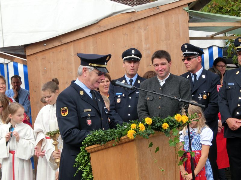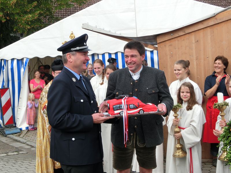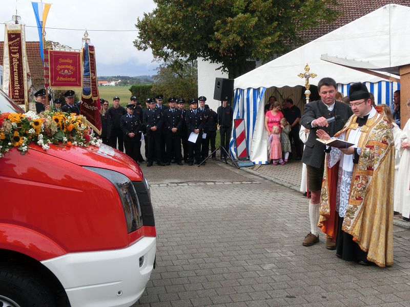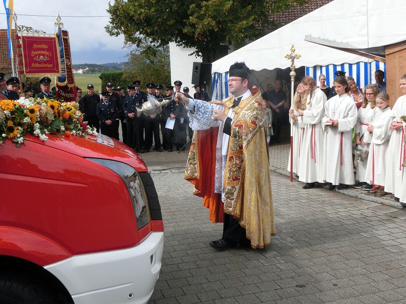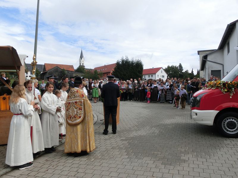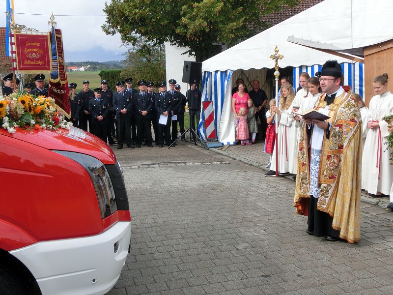 Nach einem feierlichen Festgottesdienst zog, angeführt von einer Abordnung des Musikvereins Zolling, Pfarrer Stefan Rauscher mit Ministranten, dahinter viele Feuerwehrler und Gemeindemitglieder, in Richtung Feuerwehrhaus. Dort stand schon das festlich geschmückte Fahrzeug bereit. Nach einigen Regengüssen vorher schien dazu sogar die Sonne und hielt aus bis zum Schluss der Zeremonie. Der 1. Kommandant, Norbert Wurzer, begrüßte das gesamte Kreisbrandkommando, Bürgermeister Bormann und Vorgängerin Niedermeier sowie zahlreiche Gemeinderäte. Die Finanzierung des Wagens sei getragen durch die Gemeinde Attenkirchen, einem Zuschuss des Freistaates Bayern sowie durch die Feuerwehr Attenkirchen selbst. Durch immer mehr Einsätze aufgrund des erhöhten Verkehrsaufkommens sei man gezwungen gewesen, ein neues Fahrzeug anzuschaffen. Auch für die Jugendausbildung sei dies vonnöten. Dann übergab er an Pfarrer Rauscher, der das Fahrzeug sowie die Anwesenden mit Weihwasser segnete. Anschließend übernahmen noch Bürgermeister Bormann sowie Kreisbrandrat Fischer das Mikrofon und wünschten allen Beteiligten viel Glück bei ihren Einsätzen mit dem neuen Feuerwehrfahrzeug.