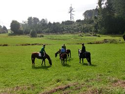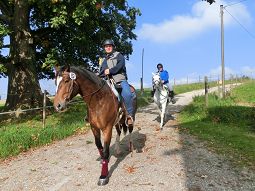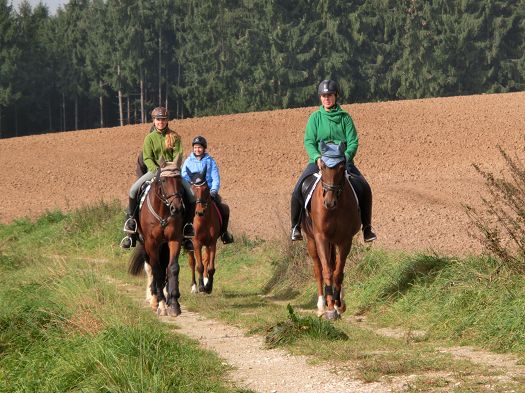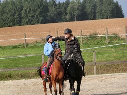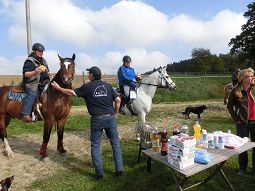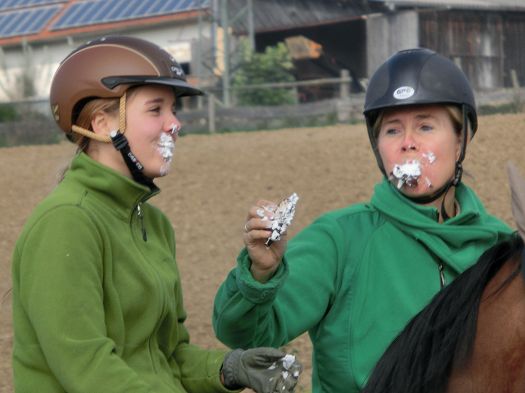 Jeweils in kleinen Gruppen machten sich die Teilnehmer auf den Weg, 5 Stationen mit unterschiedlichen Aufgaben mussten unterwegs bewältigt werden. Anfangs musste man vom Pferd aus ein Tor öffnen und schließen, bei der 2.Station am richtigen Jägerstand vorbeireiten und die Sprossen zählen, danach zusammen mit dem Pferd durch einen Hullahupreifen steigen. Richtig lustig wurde es auf der 4. Station, auf dem Reitplatz der Reitanlage Rohregg mussten jeweils 2 Teilnehmer nebeneinander traben und sich dabei einen Negerkuss in den Mund schieben. Entsprechend sahen danach die Gesichter aus!