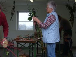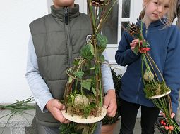 Diejenigen, die sich aber auf dem Hof des Fachwartes in Pfettrach einfanden, waren mit Begeisterung bei der Sache. Mit langen dünnen Zweigen oder starken Gräsern wurde das Außengerüst gebaut, verziert mit Hagebutten, Zieräpfeln, Tannenzapfen, Moos und Efeu. Das war jedem selbst überlassen, welche Materialien er bevorzugte. In der Mitte, auf einer Art Plattform, wurden dann Meisenknödel plaziert, die die Vögel durch das Gebinde hindurch erreichen können. Das Ganze ist aber nicht nur für die Tiere praktisch, sondern durchaus auch eine Dekoration vor dem Haus oder im Garten.