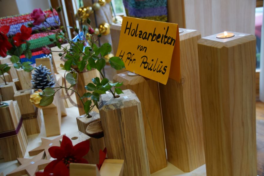 Seit Monaten bastelten und backten die fleißigen Damen des Frauenbundes ehrenamtlich 3x die Woche in zwei Schichten, Vormittags- und Nachmittagsschicht. Und auch Stadtpfarrer Josef Paulus war mit von der Partie, er kreierte Kerzenständer aus Holz.