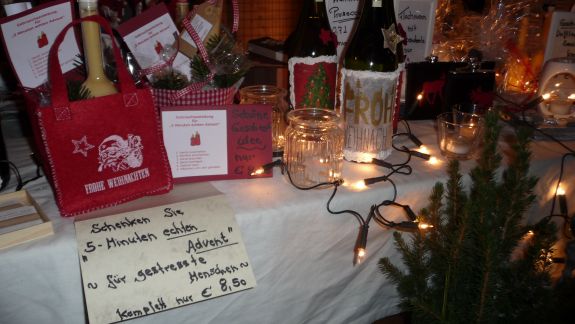 Fehlen durfte natürlich nicht Glühwein, Ministrantenpunsch und der gute alte Jägertee – und das alles zwischen Schmuck, textilen Erzeugnissen, weihnachtlicher Zierde und jeder Menge Floristik. Auch selbstgemachte Naturseifen aus hochwertigen Ölen und eine Auswahl an liebevoll gestaltetem Kinderspielzeug wie der „Reckturner“, ein beweglicher Akrobatturner aus Holz, gab es zu kaufen. Schenken konnte man aber auch „5 Minuten Advent“ für gestresste Menschen, ein Säckchen bestehend aus einem Likör, einer Kerze, einer Weihnachtsgeschichte, Plätzchen und einem Zettel mit der Anordnung: "Handy ausschalten und Beine hochlegen".
