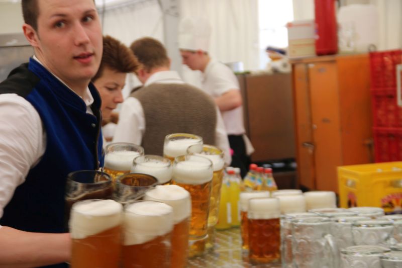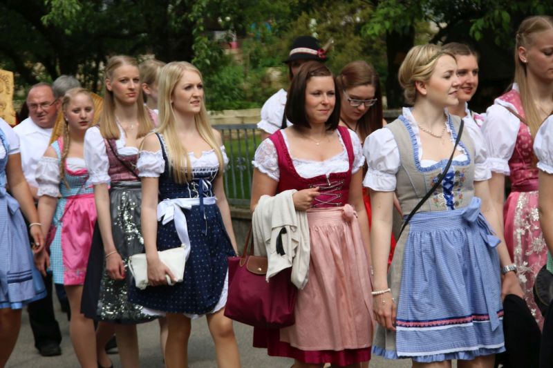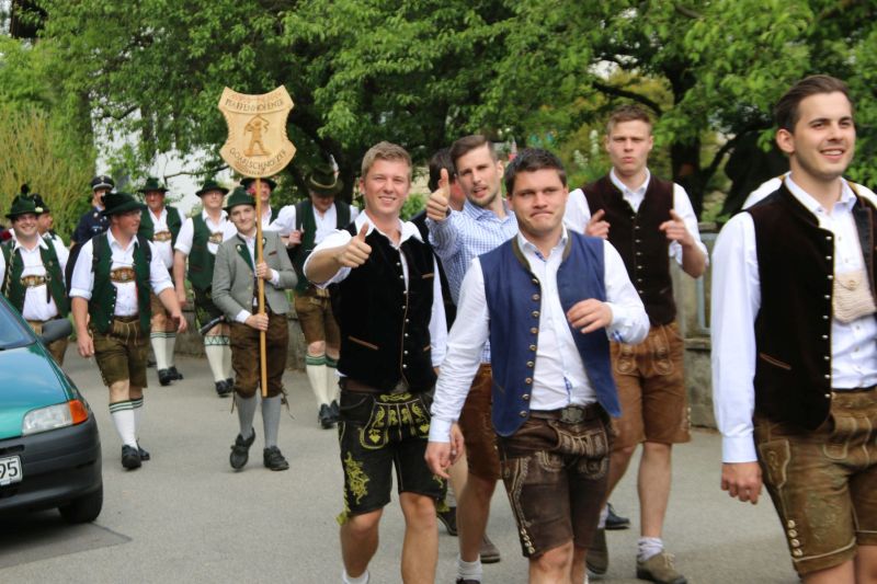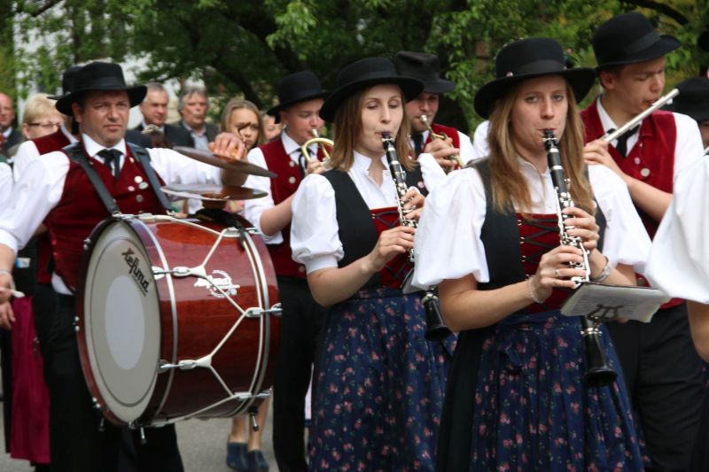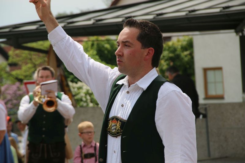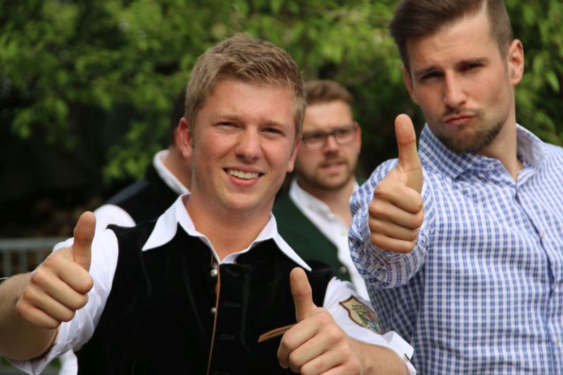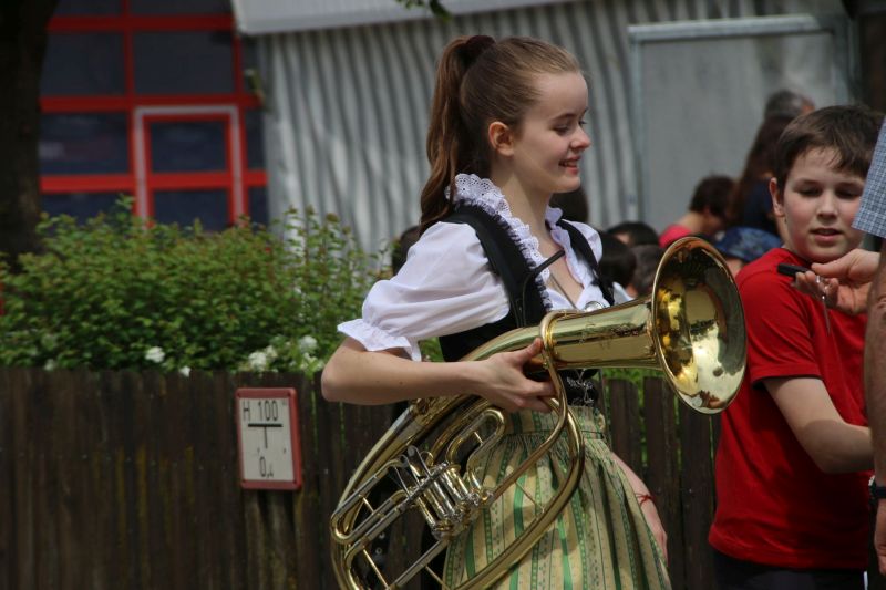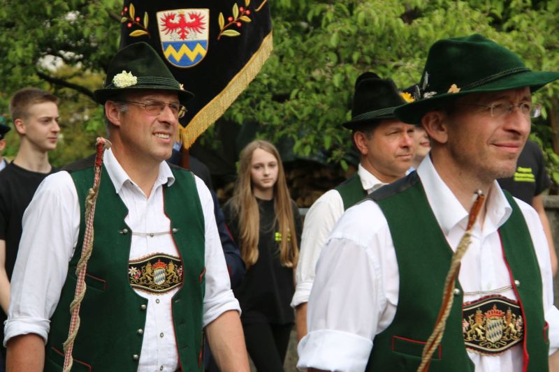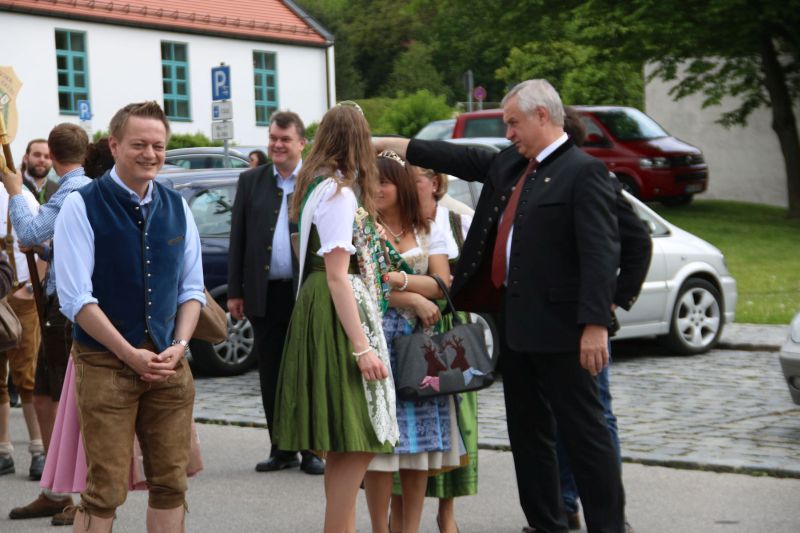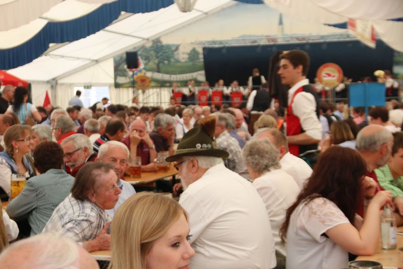 Insgesamt 33 Vereine begleiteten den Festzug vom Rathausplatz zum Volksfestgelände, angeführt von der Jugendblaskapelle der Gemeinde Reichertshausen, die musikalisch hervorragend auf die bevorstehende Atmosphäre einstimmte. War der Besucherandrang im Festzelt vor dem Eintreffen der Auszügler noch überschaubar, so kam das Servicepersonal von Festwirt Bernhard Stocker sehr schnell ins Schwitzen, als der Zug angekommen war und jeder seinen Platz an den reservierten Tischen gefunden hatte. Frühsommerliche Temperaturen einerseits, aber auch die unverzüglich überschwappende Stimmung forderten die ganz schnelle Maß, das genüsslich duftende Hendl oder andere Schmankerl aus Stockers umfangreichem Volksfest-Menü.