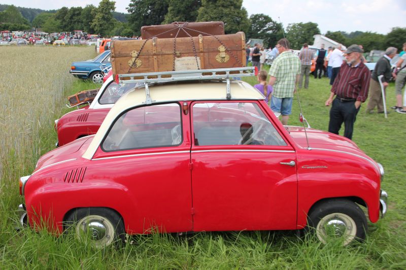 Auch Automarken, die die heutige Jugend gar nicht mehr kennt oder die Elterngeneration schon vergessen hat, wurden den Besuchern präsentiert. Das Goggomobil etwa, der Lloyd, Borgward oder NSU Prinz. Naturgemäß große Aufmerksamkeit konnten die Sportwagen erzielen, so neben den noch am ehesten aus dem Straßenbild gewohnten Porsche-Modellen auch ein Lotus und ganz besonders ein originaler Jaguar E Type.