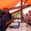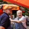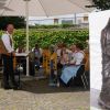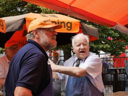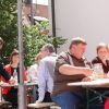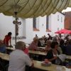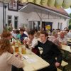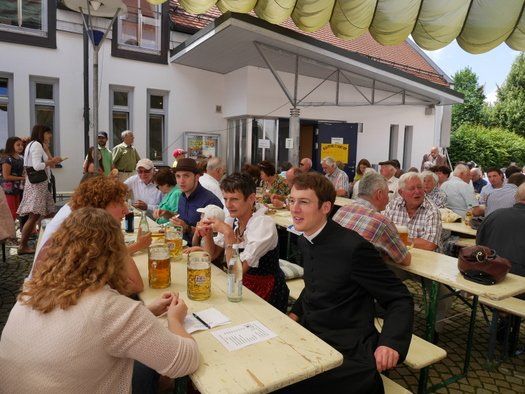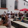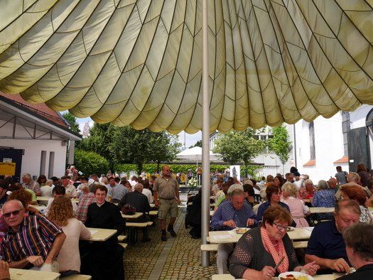Stadtpfarrer Peter Wagner feierte sein erstes Pfarrfest am Biertisch mit wachsender Begeisterung. Der Kontakt zur Gemeinde geht sicher auch durch den Magen, das gesellige Gespräch, auch mal zu Alltäglichem, ist Teil der Seelsorge. Ein großes Lob der Kolpingfamilie und den vielen freiwilligen Helfern, beste Versorgung, tolle Organisation und wie die Sache mit dem Wetter läuft, bekomme ich auch noch raus.