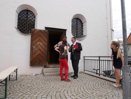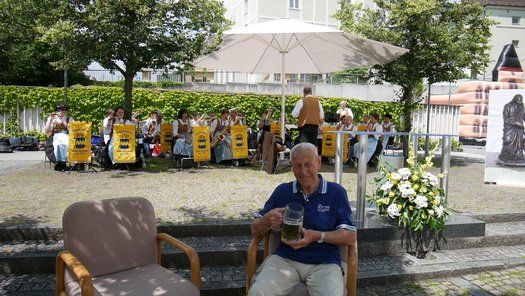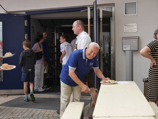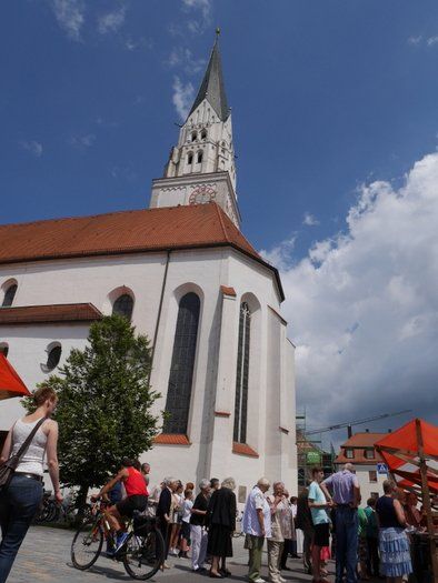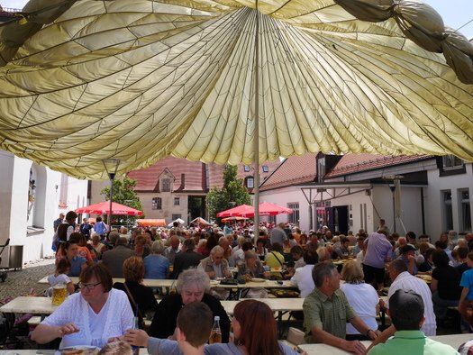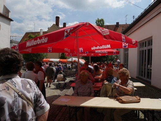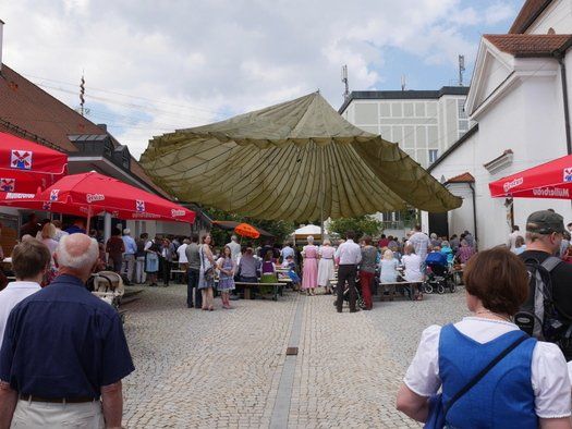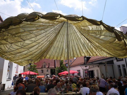 Da war er wieder, der gute Draht nach oben, bestes Wetter zum großen sommerlichen Pfarrfest unter dem weiten Lastenfallschirm am Fuße unserer prächtigen Stadtpfarrkirche St. Johannes Baptist.