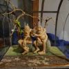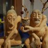 Hans Langkopf, der seit vielen Jahren die Pfaffenhofener Kunstwelt mit seinen feingliedrigen Lindenholzschnitzereien beglückt und auch bei der VHS dem Nachwuchs das Schnitzmesser führt, hat mit seiner malenden besseren Hälfte Monika, die sonst eher kahle Galerie, in ein gemütliches Zimmer verwandelt. Es gibt eine Eckbank mit ungewöhnlichen, schon sehr alten und frisch veredelten Polstern, Schaukästen zum Staunen, kleine, kleinste und rotzfreche Skulpturen, vom Tod bis zur drallen Tänzerin, Hirsche in allen Farben und Adam mit Eva im Rentenalter.