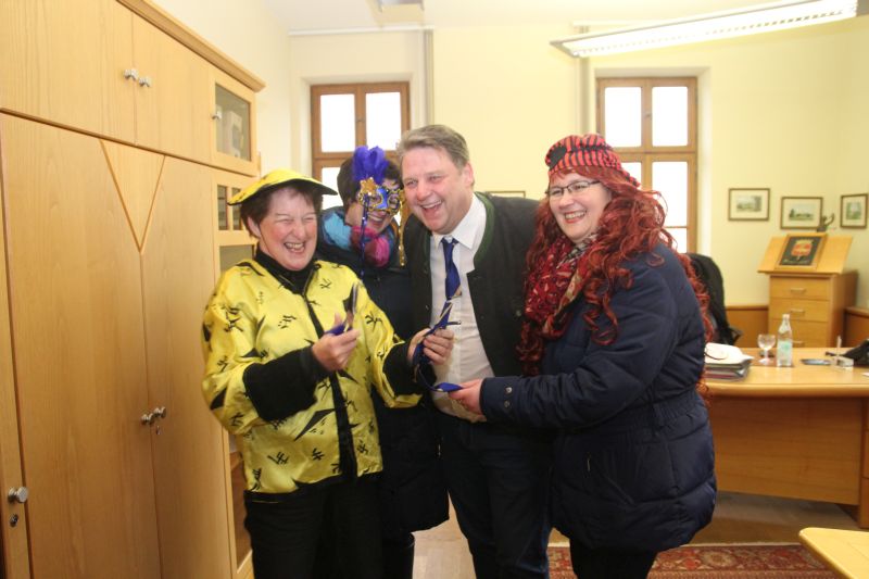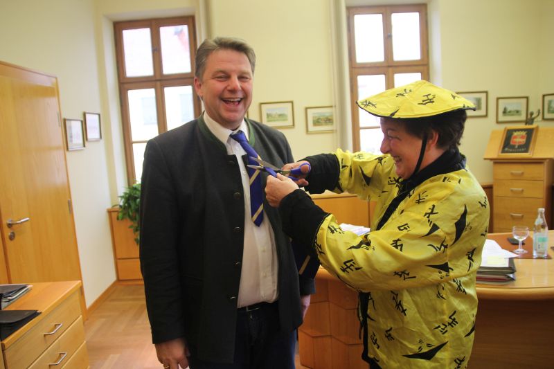 … und ab war sie! Mit einem schnellen Schnitt war die Krawatte von Bürgermeister Jens Machold nicht nur um ein gutes Stück kürzer, nein viel mehr übernahm auch Wolnzachs dritte Bürgermeisterin von diesem Zeitpunkt an das Regiment und läutete auch in Wolnzach die närrische Zeit ein.