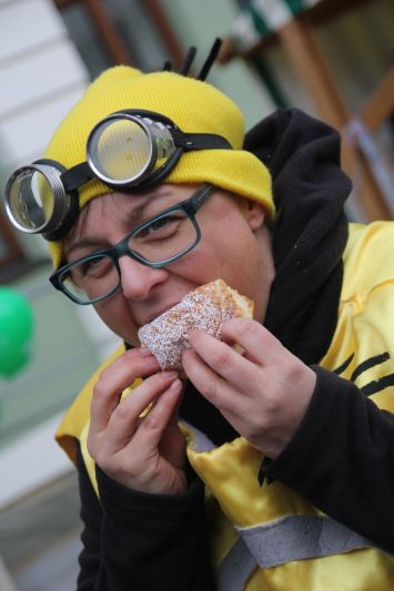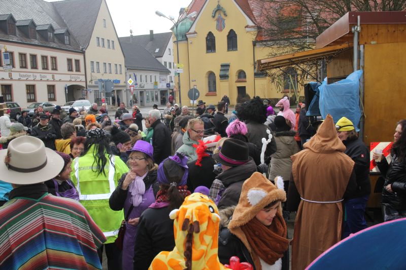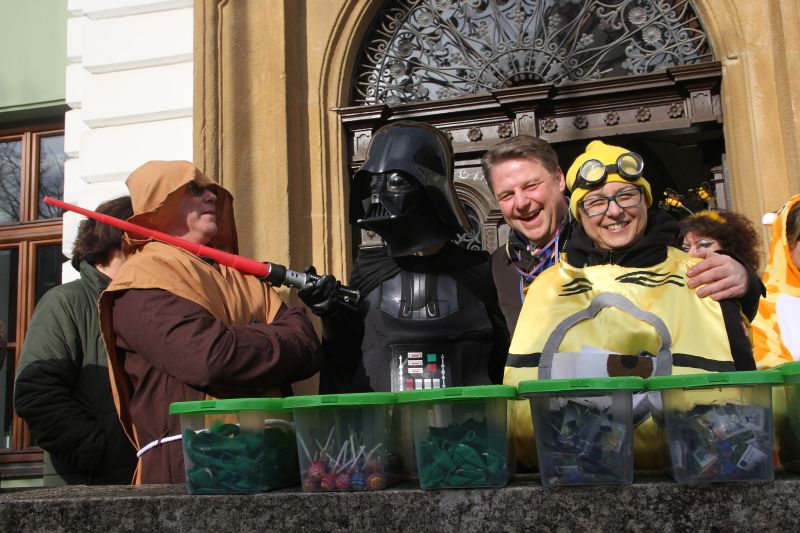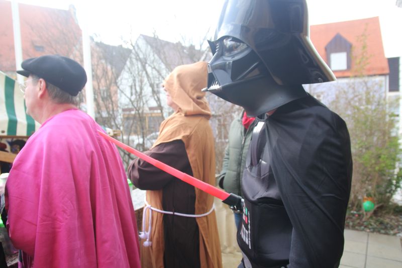 Gemäß dem Motto „Narrheit gibt Freiheit“ wurde die Amtsstube kurzen Hand auf den Rathausplatz verlegt. Dort hatten sich auch bei eher frostigen Temperaturen schon zahlreiche Jecken und Narren eingefunden, um es so richtig krachen zu lassen. Bunt, schräg und auch ein bisschen schrill waren die Kostüme, in denen die Wolnzacher gekommen waren, um den unsinnigen Donnerstag in Wolnzach standesgemäß zu beginnen. Von einem Lichtschwert schwingenden Darth Vader bis hin zu Bob Marley war alles vertreten. Und so wurde anstatt Anträge in den Amtsstuben bearbeitet, doch lieber gemeinsam mit den Wolnzachern gefeiert.