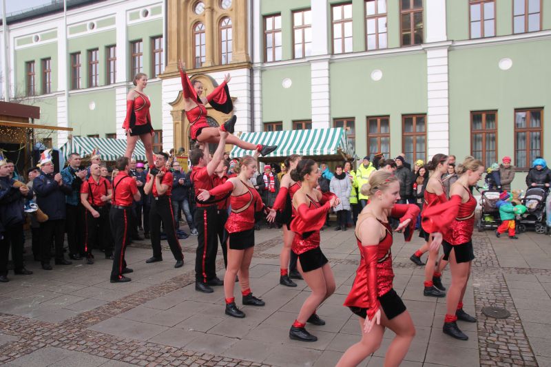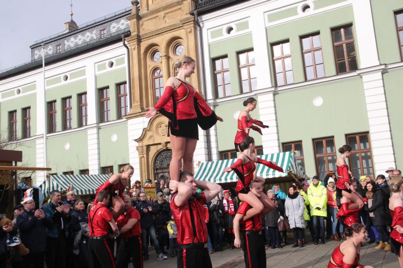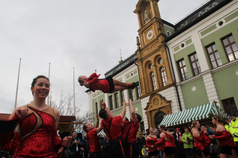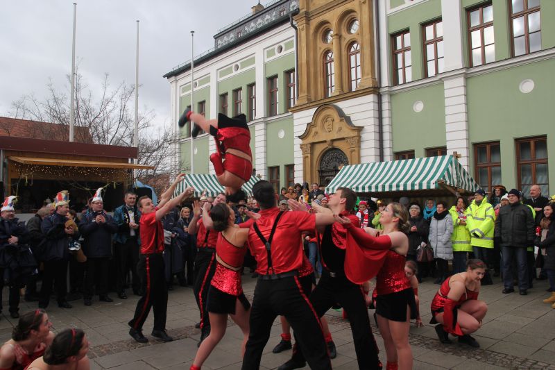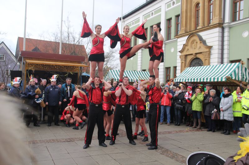Das Highlight am Vormittag: der Auftritt der Narhalla Ilmmünster. „Es freut mich natürlich sehr, dass wir zum Auftakt der heißen Faschingszeit wieder hier in Wolnzach vor dem Rathaus auftreten dürfen“, so Präsident Martin Schlicht. Und so heizten die Mädels und Jungs um das Prinzenpaar Bettina I. und Stephen III. den Wolnzachern mit einem zackigen Marsch, einem flotten Walzer und einem von Akrobatik getragenem Showteil gehörig ein. Der kalte Wind war schnell vergessen und passend zu Musik wurde in die Hände geklatscht. „Das ist doch wirklich ein schöner Auftakt in die närrische Zeit“, so Bürgermeister Jens Machold. Doch neben allem Spaß, gab es auch viel Anerkennung seitens der Gemeinde: denn wie schon im vergangenen Jahr so wurden auch in diesem wieder Orden an Wolnzacher verliehen, die sich in besonders um ihre Gemeinde verdient gemacht haben.