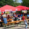 Und jetzt kommen die Englein ins Spiel: denn pünktlich zum Start des Spendenlaufs zeigte sich der weiß-blaue Himmel von seiner allerbesten Seite. 44 Kinder machten sich auf die für sie 750 Meter lange Runde, 59 teilnehmende Erwachsene hatten je Runde 2 Kilometer zu absolvieren, um sie angerechnet zu bekommen. Denn je Runde wurden von einer Sponsorengruppe 2 Euro für Lacrima gespendet. Die Kinder schafften alle gemeinsam 291 Runden, die Erwachsenen 306, was ein doch erkleckliches Sümmchen in die Spendenkasse fließen ließ. Hinzu kamen dann noch die Standgebühren für die Flohmarkttische und die Spenden der ortsansässigen Caterer, die für Speis' und Trank bei diesem Familienfest sorgten.