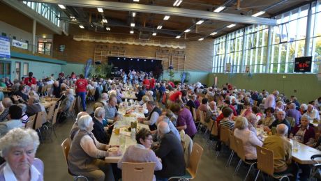 977 Seniorinnen und Senioren wurden von der Gemeinde eingeladen, Busse zur Anfahrt bereitgestellt und es kamen 325 in die Turmberghalle zum Senioren-Nachmittag....
