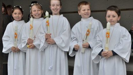 Ein besonderer Tag für drei Mädchen und zwei Buben war der heutige Sonntag: Die fünf jungen Katholiken feierten nämlich ihre Heilige Erstkommunion. Zur Gestaltung...