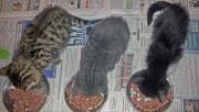Raubtierfütterung in Reih und Glied: 3 Kätzchen von insgesamt 15 kleinen Rackern, die bereits selber fressen. Sie sind 5 bis 6 Wochen alt und müssen noch so lange...