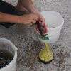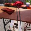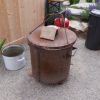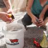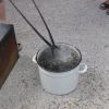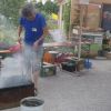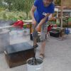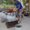 Bei gut 900 Grad öffnet Moddy Motzke den mobilen Gasbrandofen und entnimmt mit einer langen, eisernen Zange die glühend heißen Keramikteile. Ein Blechkasten, gefüllt mit Sägespänen, ist der nächste Ort in dem die Kunstwerke abkühlen können. Bei dieser Schocktherapie für das Material entstehen Risse, in die sich dann der Kohlenstoff des Holzes, der bei seiner Verbrennung entsteht, einbindet. Nach ungefähr 10 Minuten ist das Werkstück soweit abgekühlt, das es endgültig im Wasserbad abgelöscht werden kann.
