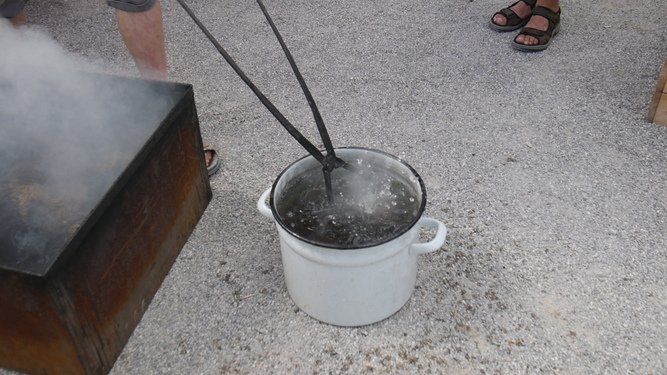 Hohle Teile, wie Figuren, brauchen eine Sonderbehandlung, damit die heiße Luft im Inneren, dampfend entweichen kann. Was genau bei diesem Abschrecken passiert, richtet sich nach den verwendeten Rohstoffen und ist immer wieder ein Abenteuer.