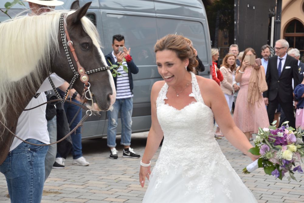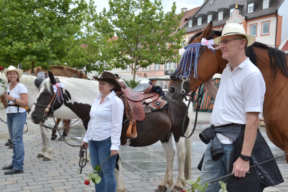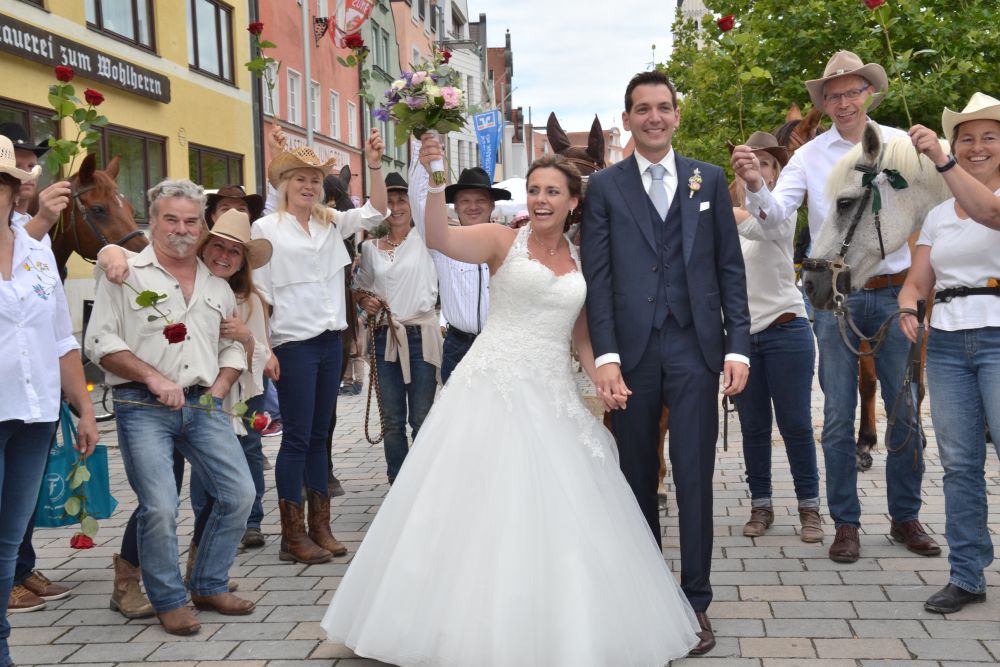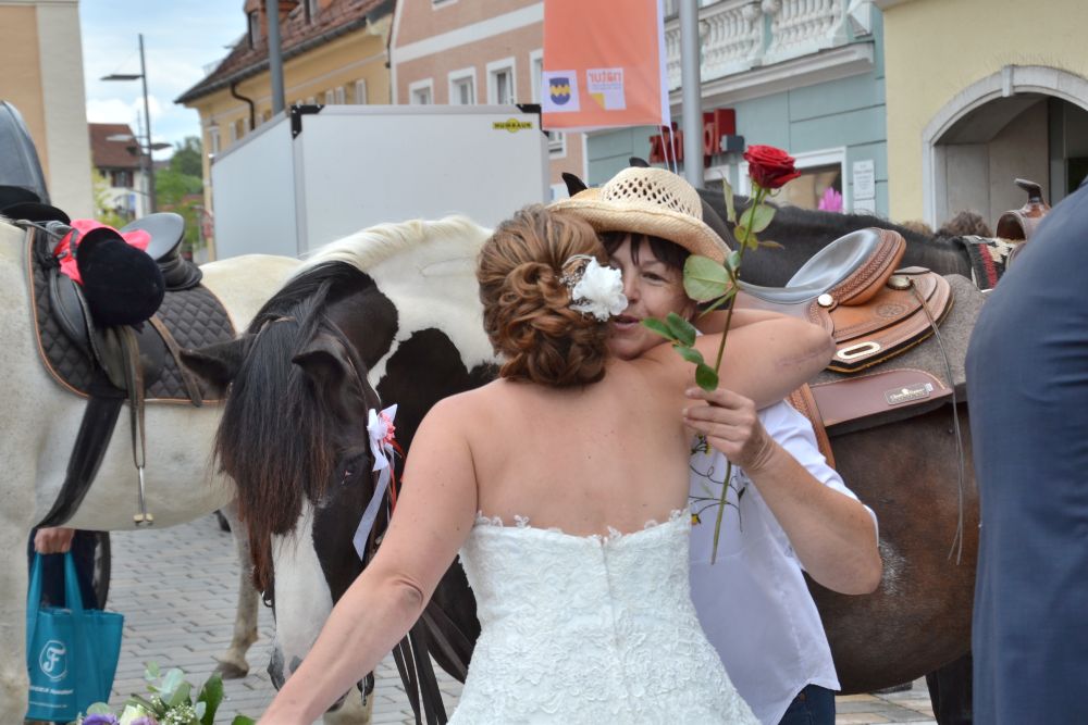 An diesem Wochenende wunderten sich die Besucher des Wochenmarktes und der umliegenden Cafés über Reiter mit ihren Pferden auf dem Hauptplatz. Man hätte meinen können, es würde ein Western-Film gedreht. Doch es stellte sich heraus, dass die Mitglieder des Moonlight-Reitstalls auf die Brautleute warteten, die dort auch beide reiten. Als dann das frisch getraute Paar das Rathaus verließ, brach ein Jubel der Freunde aus und die Braut schien vor lauter Freude total perplex als sie ihre Freunde mit den Pferden sah. Jeder aus dem Freundeskreis hatte eine Rose dabei, die sie dem Paar überreichten. Aber Braut Steffi und Bräutigam Martin verließen den Hauptplatz dann nicht per Pferd, sondern schwangen sich in ihren PKW und brausten zur Hochzeitsfeier, nachdem die Pferdefreunde ihren kleinen Umtrunk bekommen hatten.