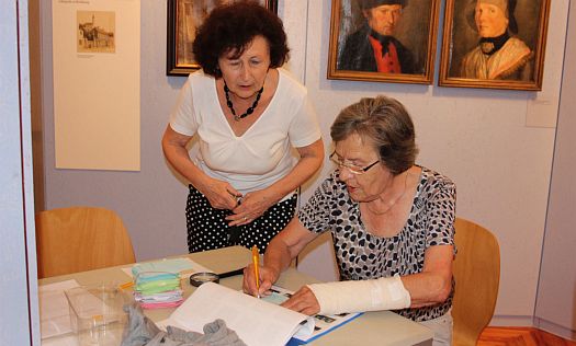 Brigitte Berg (links) und eine Mainburgerin bei der Sichtung und Wiedererkennung der kleinformatigen Schwarz-Weiß Bilder aus dem Gschwendtner Nachlass